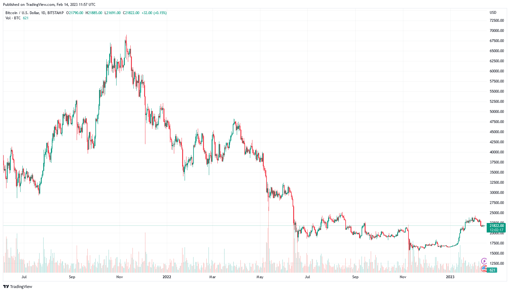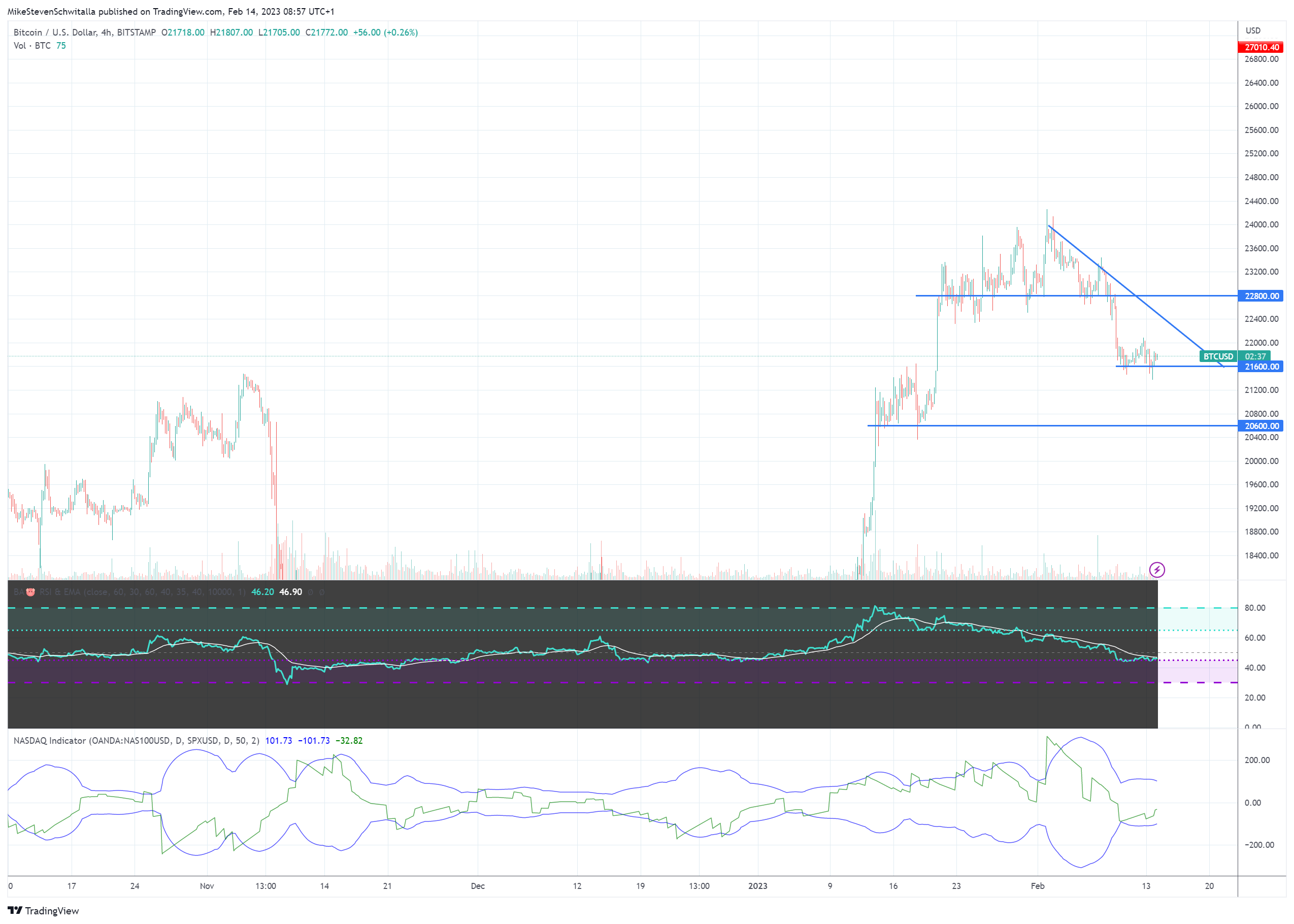 Seit letztem Freitag befinden wir uns in einer Konsolidierungsphase mit einer Spanne von 21'600 USD bis 22'000 USD. Dennoch ist der Abwärtstrend intakt und es scheint wahrscheinlich, dass die Unterstützung bei 21'600 USD nach unten durchbrochen wird. Meiner Meinung nach ist daher ein Kursziel von 20'600 USD realistisch.