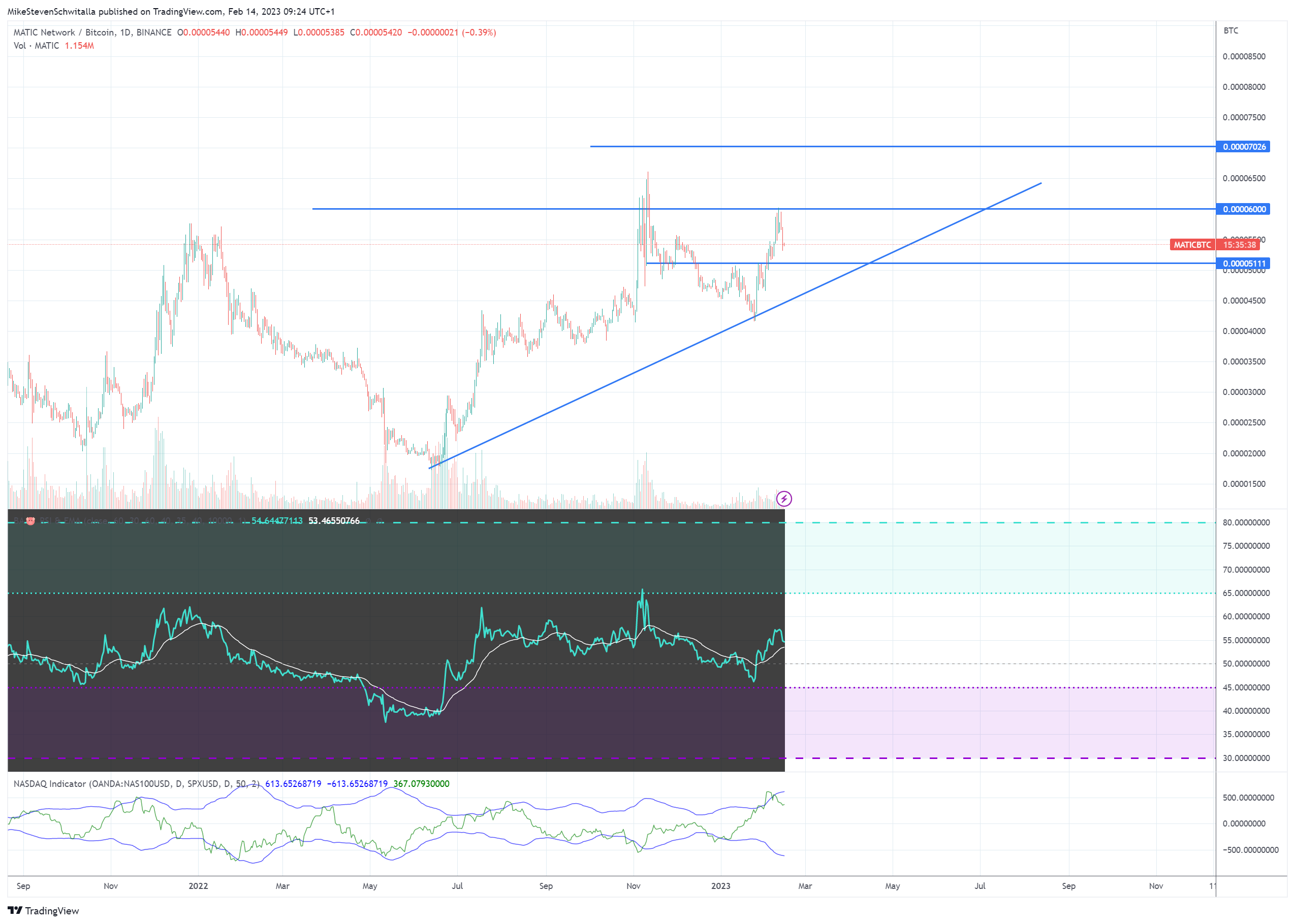 MATIC vs. BTC bildet ein interessantes langfristiges technisches Setup. Der Aufwärtstrend ist seit Monaten intakt und es scheint sich Druck in Richtung des langfristigen Widerstands bei 0.0006 aufzubauen. Meiner Meinung nach könnte ein potenzieller Handel wie folgt aufgebaut sein: