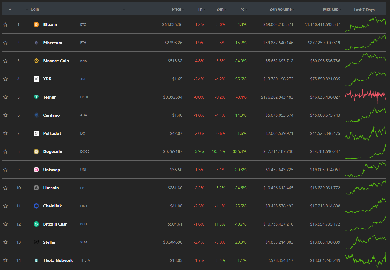 Gewinner der Woche sind: Dogecoin (DOGE) +336.4%, Ripple (XRP) +56.6%, Bitcoin Cash (BCH) +40.7%, Chainlink (LINK) +25.5% und einige weitere. "Verlierer" gab es diese Woche keinen einzigen, leicht underperformt haben: Theta Network (THETA) +1.1%, Polkadot (DOT) +1.6% und Bitcoin (BTC) +4.8%.