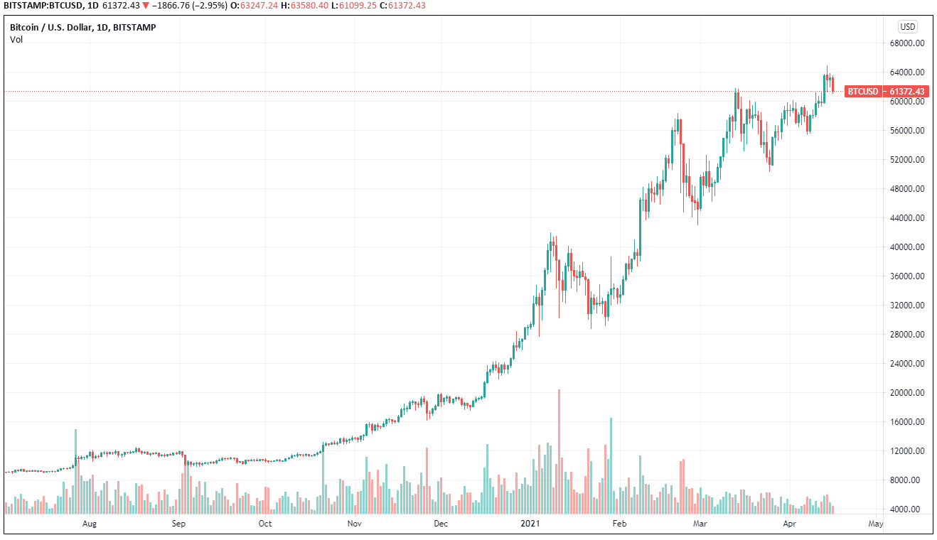 Diesen Dienstag, am Tag des Börsengangs von Coinbase, erreichte Bitcoin ein neues Allzeithoch bei $64'900. Seitdem haben wir eine kleine Korrektur (-5%) erlebt und befinden uns bei $61'200.