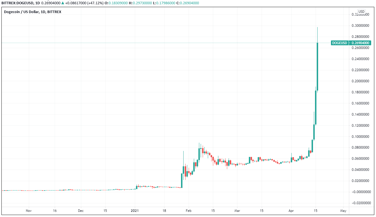 Einer dieser Coins sticht stark heraus: Dogecoin (DOGE). Der Chart ist fast vertikal, die Preisbewegungen vor einem Monat sind gar nicht mehr zu sehen. In unter einer Woche hat sich Dogecoin mehr als verdreifacht und ist erneut in die Top 10 nach Marktkapitalisierung eingedrungen.