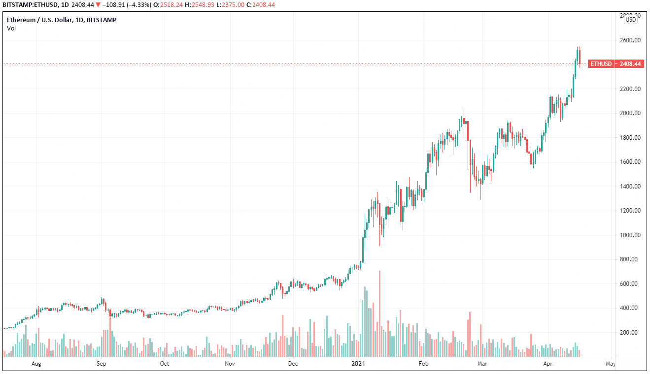 In den letzten zwei Monaten hatte Ethereum etwas Mühe, mit Bitcoin mitzuhalten. Doch nun zeigte die zweitgrösste Kryptowährung erneut Stärke und schoss auf ein neues Allzeithoch von $2'500. Auch hier gab es eine kurzfristige Korrektur (-6%).
