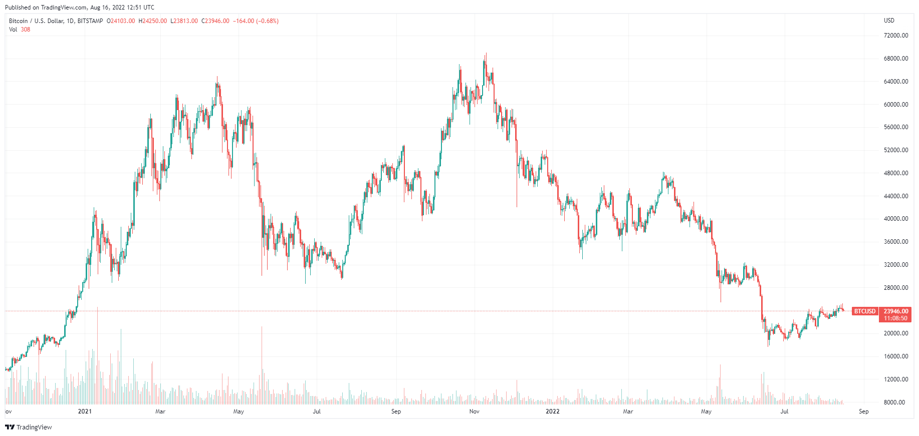 Bitcoin testet das Aufwärtsdreieck: ein Durchbruch über den Widerstand bei 25'000 USD könnte BTC den Weg zu 30'000 USD vor Mitte September ebnen. Das Volumenprofil (VPVR) zwischen 25k und 30k USD ist fast nichts.