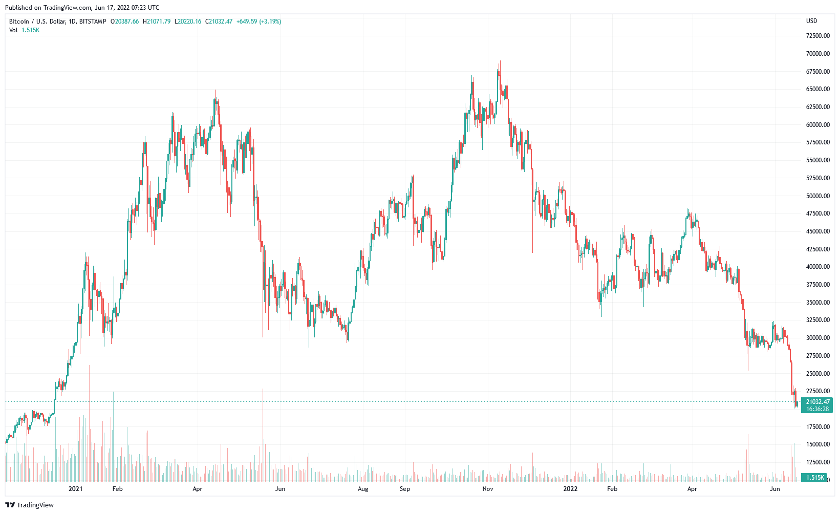 Eine weitere blutige Woche geht zu Ende. Derzeit handelt Bitcoin (BTC) bei 20'500 USD (-30% in 7 Tagen), Ethereum (ETH) bei 1'080 USD (-39% in 7 Tagen), und der ETH/BTC-Spread liegt bei 0.05273 (-11.3% in 7 Tagen).