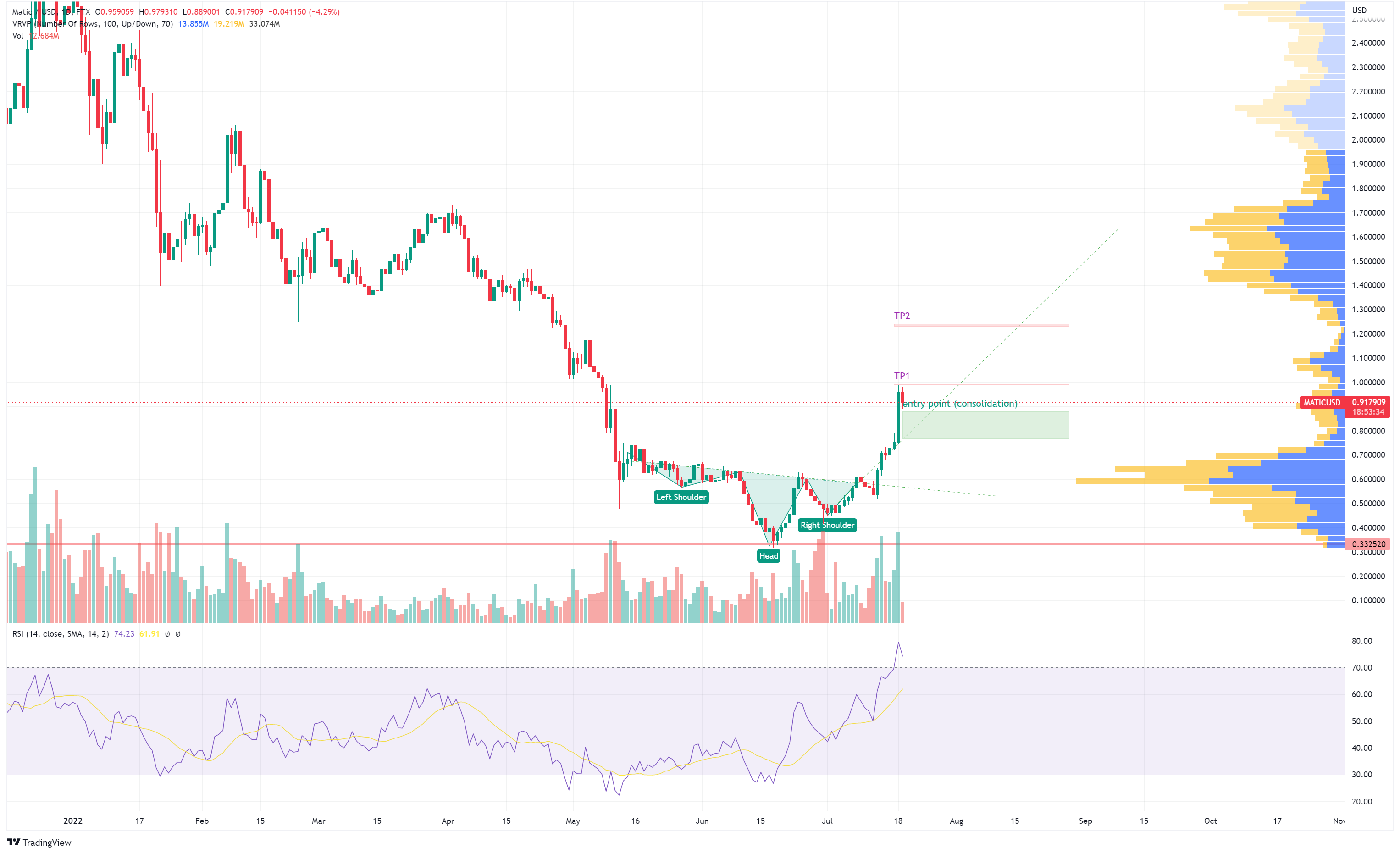 MATIC stieg nach der Bestätigung der umgekehrten Head & Shoulders-Kurve leicht an. Der RSI ist überkauft, da wir uns in einer Konsolidierungsphase befinden. Ich freue mich auf die langsam Akkumulation und auf die kurzfristige Umkehr zu warten (zwischen 0.75 USD und 0.88 USD). Dann wird es mich nicht überraschen, wenn MATIC wieder über 1 USD notiert. Hier sind meine Gewinnmitnahmen: 0.999 USD (tp1) und 1.22 USD (tp2).