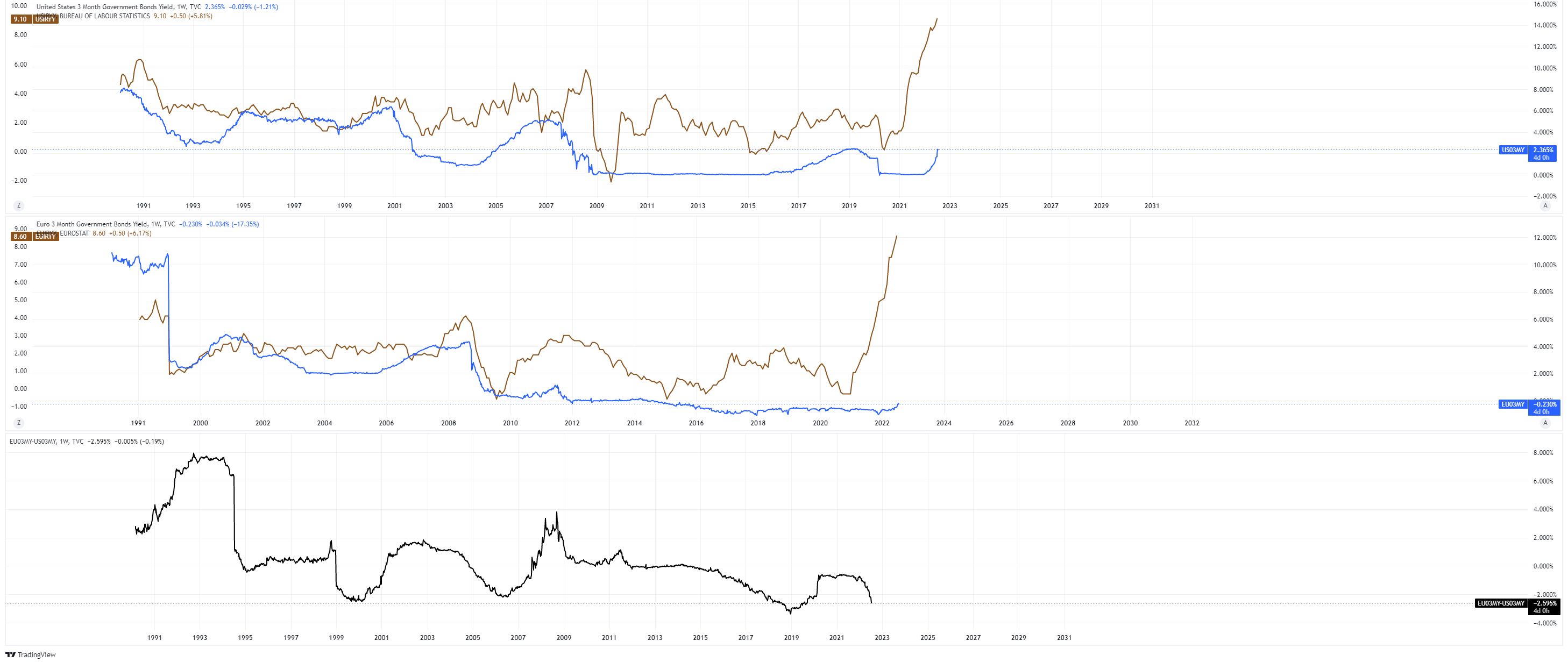 Die für die Fed-Sitzung am 27. Juli erwarteten Zielsatzwahrscheinlichkeiten: 69.1% Wahrscheinlichkeit für einen Zielsatz von 225-250 (75 Basispunkte) und 30.9% Wahrscheinlichkeit für einen Zielsatz von 250-275 (100 Basispunkte). Meiner Meinung nach sind die Marktteilnehmer jetzt gut positioniert und haben sich aus den meisten riskanten Positionen zurückgezogen. Das bedeutet, dass selbst eine Zinserhöhung um 1% nicht so dramatisch, sondern eher notwendig sein wird. Das Risiko mit einem jetztigen Verkauf ist im Vergleich zu Käufen gering. Der DXY liegt bei 107.4 und die 10-jährige US-Rendite wird mit 2.971% gehandelt. Ich fühle mich wohl, wenn ich meine USD jetzt in andere Vermögenswerte investiere. Vergleicht man die Zahlen für die USA mit denen für die EU, so ist die Situation dramatisch: