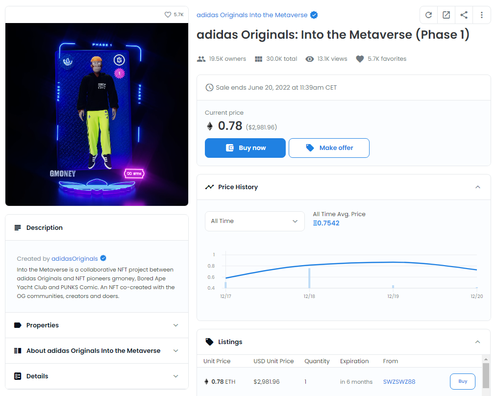 Kommen wir nun zu etwas lustigeren Themen. Adidas hat sein Metaversum NFT Drop von 30'000 Stück gestartet. Natürlich habe ich weder beim Drop noch beim Early-Access-Verkauf, der am 14. Dezember stattfand, welche bekommen (die meisten NFTs gingen an gut programmierte Bots).