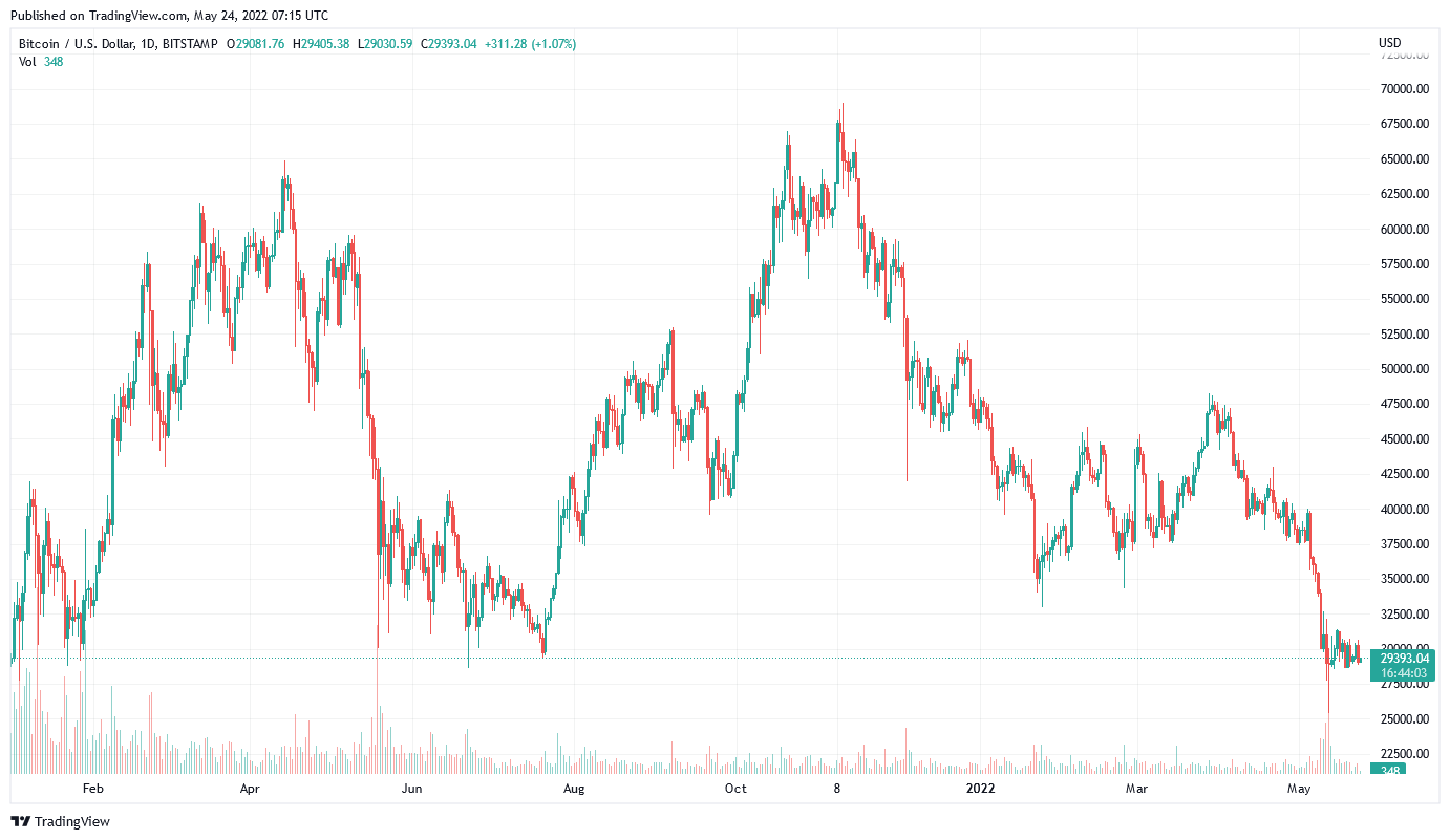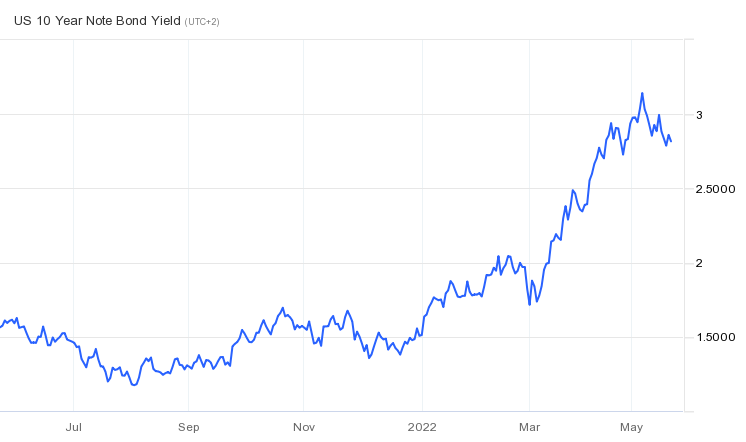 Der Markt sieht höhere Inflationszahlen, was in Verbindung mit negativen - oder nahe Null liegenden - Zinssätzen auf sichere Fluchtwährungen (z.B. CHF) die Nachfrage nach USD ansteigen lässt. Der USD-Währungsindex (DXY) stieg von 96 im Januar 2022 auf 104 am 14. Mai. Er liegt jetzt bei 102, und wenn er einen grösseren Rückschlag erleidet, wird auch die Kryptobranche davon profitieren. Ich bin immer noch der Meinung, dass die realen Inflationszahlen viel schlechter sind als die des CPI. Ich glaube, dass der Zinsmarkt die realen Auswirkungen einer strafferen Geldpolitik weitgehend unterschätzt. Daher könnte die 10-jährige US-Staatsanleihenrendite deutlich über 3% liegen.