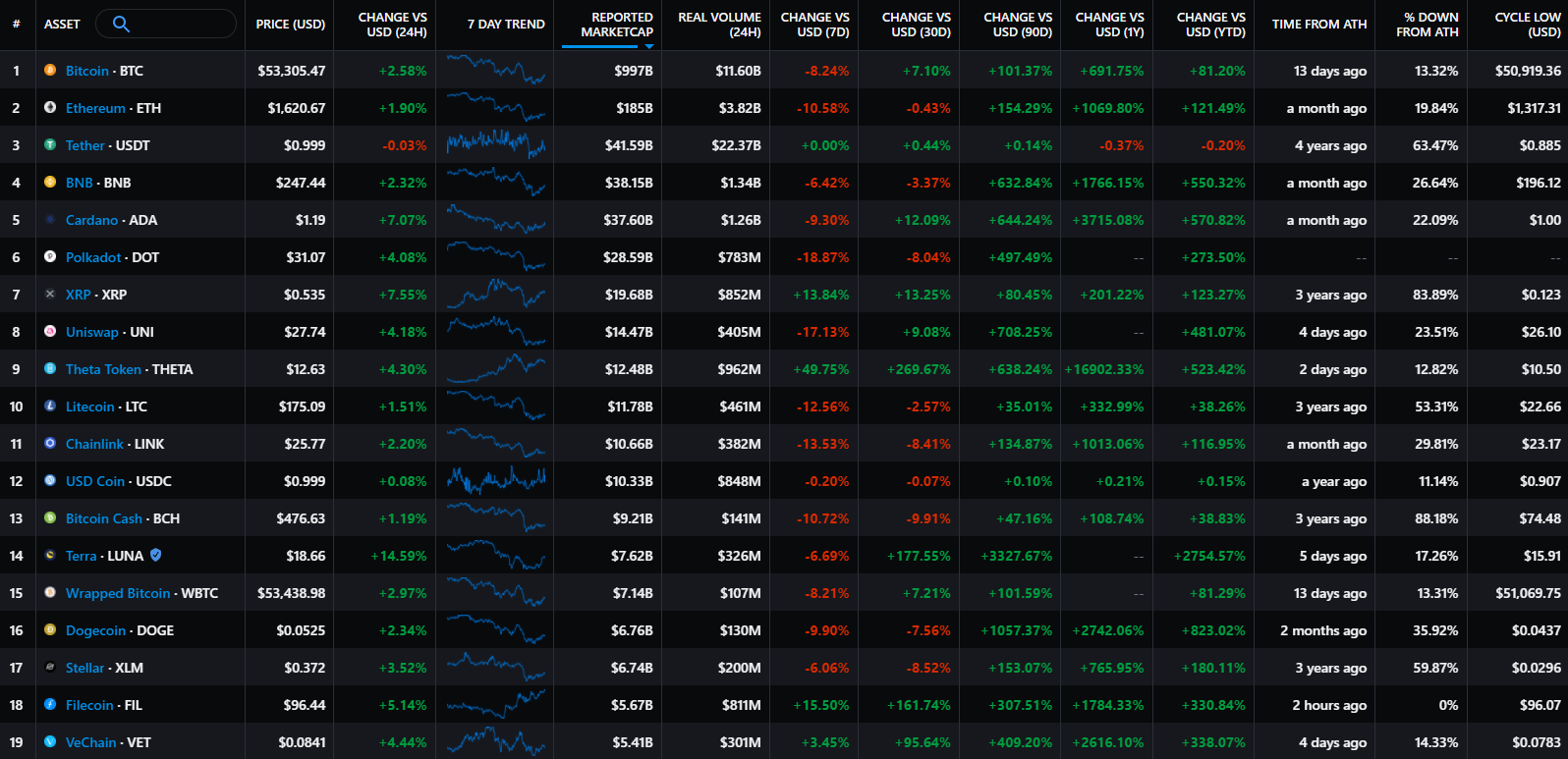 Die (einzigen) Gewinner der Woche sind: Theta Token (THETA) +49.75%, Filecoin (FIL) +15.50% und Ripple (XRP) +13.84%. Verluste einstecken mussten: Polkadot (DOT) -18.87%, Uniswap (UNI) -17.13%, Chainlink (LINK) -13.53% und einige weitere.