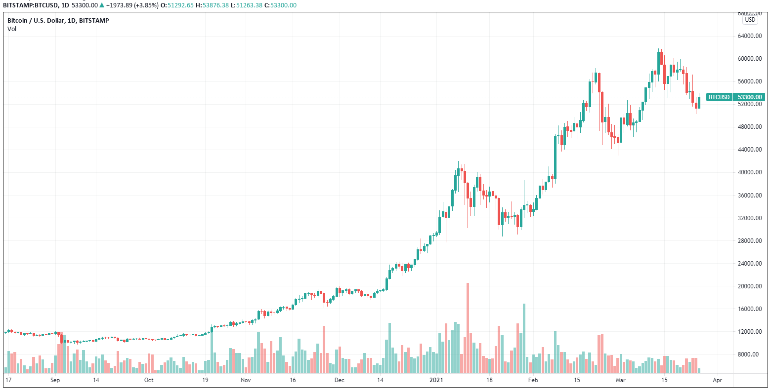 Nachdem Bitcoin vor knapp zwei Wochen ein neues Allzeithoch bei $62'000 erreichte, folgte eine weitere Korrekturperiode (-18%). Im Rahmen der Makro-Struktur handelte es sich hierbei um eine gesunde Verschnaufpause.