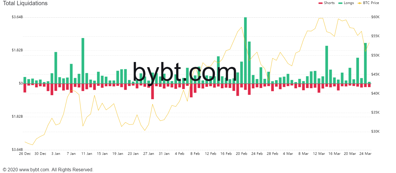 Die Unterstützung um rund $1'600 sollte halten, sonst könnten wir einen erneuten Test des 2017/18 Allzeithochs bei $1'400 sehen. Das Ausmass des kurzfristigen Abwärtstrends wurde wahrscheinlich (wieder) von überhebelten Tradern verstärkt. Innerhalb von nur 24h wurden diesen Mittwoch $2.23 Milliarden an Longs liquidiert.