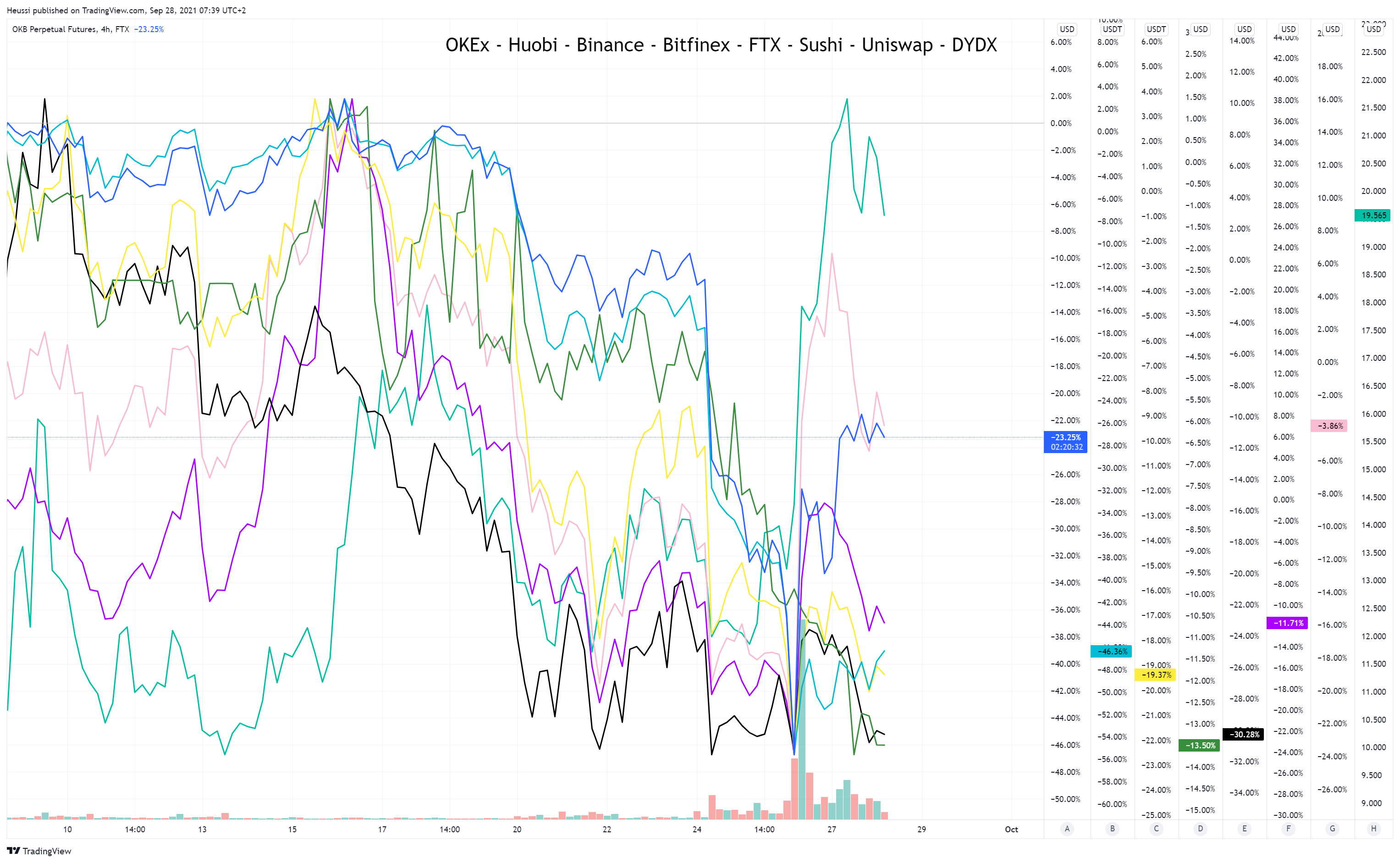 Nach der weiteren Verschärfung der Vorschriften in China und der anschliessenden Abwanderung von Nutzern und Kapital zu anderen Börsenplätzen hielt ich es für sinnvoll, ein Diagramm zu erstellen. Ich habe sowohl grössere Börsen, die über einen Börsen-Token verfügen, als auch dezentrale Börsen einbezogen.