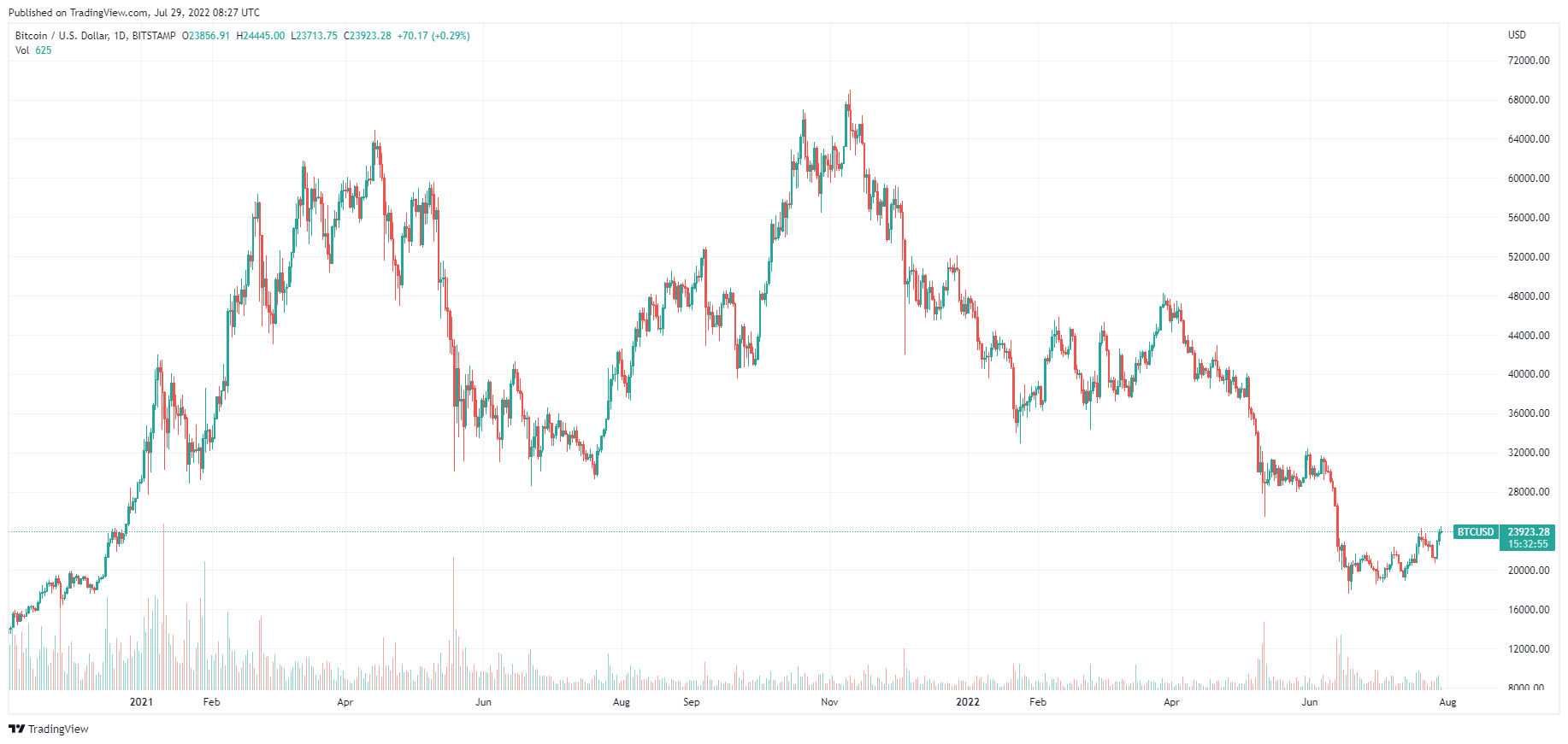 Wir hatten eine weitere grüne Woche: Bitcoin (BTC) wird bei 23.9k USD gehandelt (+3.44% in 7 Tagen), Ethereum (ETH) bei 1.71k USD (+8.92% in 7 Tagen), und der ETH/BTC-Spread liegt bei 0.0716 (+5.2% in 7 Tagen).