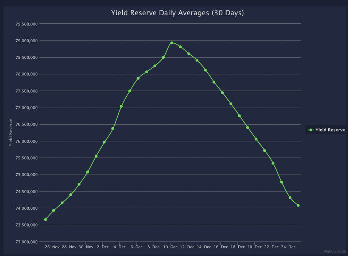 Der grösste Teil des Überschusses der Einnahmen des Anchor Protokolls fliesst in die sogenannte YR (Yield Reserve). Sie können unten sehen, dass die Renditereserve zunimmt, wenn die Kryptopreise insgesamt steigen, und dass die Renditereserve abnimmt, wenn sich die Märkte abkühlen. Do Kwon (der Gründer von Terra) ist der Ansicht, dass die effektiven Geldmarktsätze im Krypto-Ökosystem in über 55% der Fälle über dem Festgeldsatz des Anchor Protokolls von 19.5% liegen. Mit der Zeit würde dies zu einem Gesamtüberschuss des YR führen. Sollte ein Bärenmarkt länger dauern als erwartet, wird der YR bis auf Null heruntergefahren und der 19.5%ige Festgeldsatz wird neu angepasst. Do Kwon glaubt, dass mit den Staking-Belohnungen und den ANC-Airdrop-Anreizen der Festgeldsatz bei etwa 15% liegen wird.