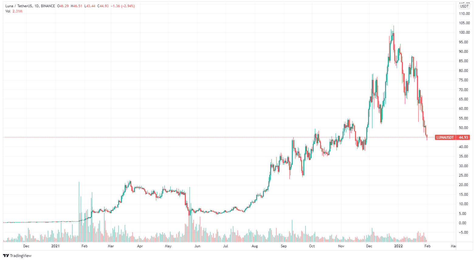 Wenn also UST geprägt wird, wird LUNA verbrannt. Mit anderen Worten: Steigt die Nachfrage nach UST, sinkt das Angebot an LUNA (und umgekehrt). Es besteht eine starke Korrelation zwischen der Marktkapitalisierung von UST und dem Preis von LUNA. So kam es beispielsweise im Herbst 2021 zu einem starken Anstieg der Nachfrage nach UST aufgrund der zunehmenden Beliebtheit des Anchor-Sparprotokolls und der neu entwickelten DeFi-Protokolle, die auf Terra aufbauten. Dies führte zur Verbrennung von LUNA = geringeres Angebot (Deflation). Da weniger LUNA im Umlauf waren, stieg der LUNA-Preis in Verbindung mit der Beliebtheit des Anchor-Protokolls deutlich an. Sowohl die UST-Marktkapitalisierung als auch der LUNA-Preis stiegen um fast 300%.