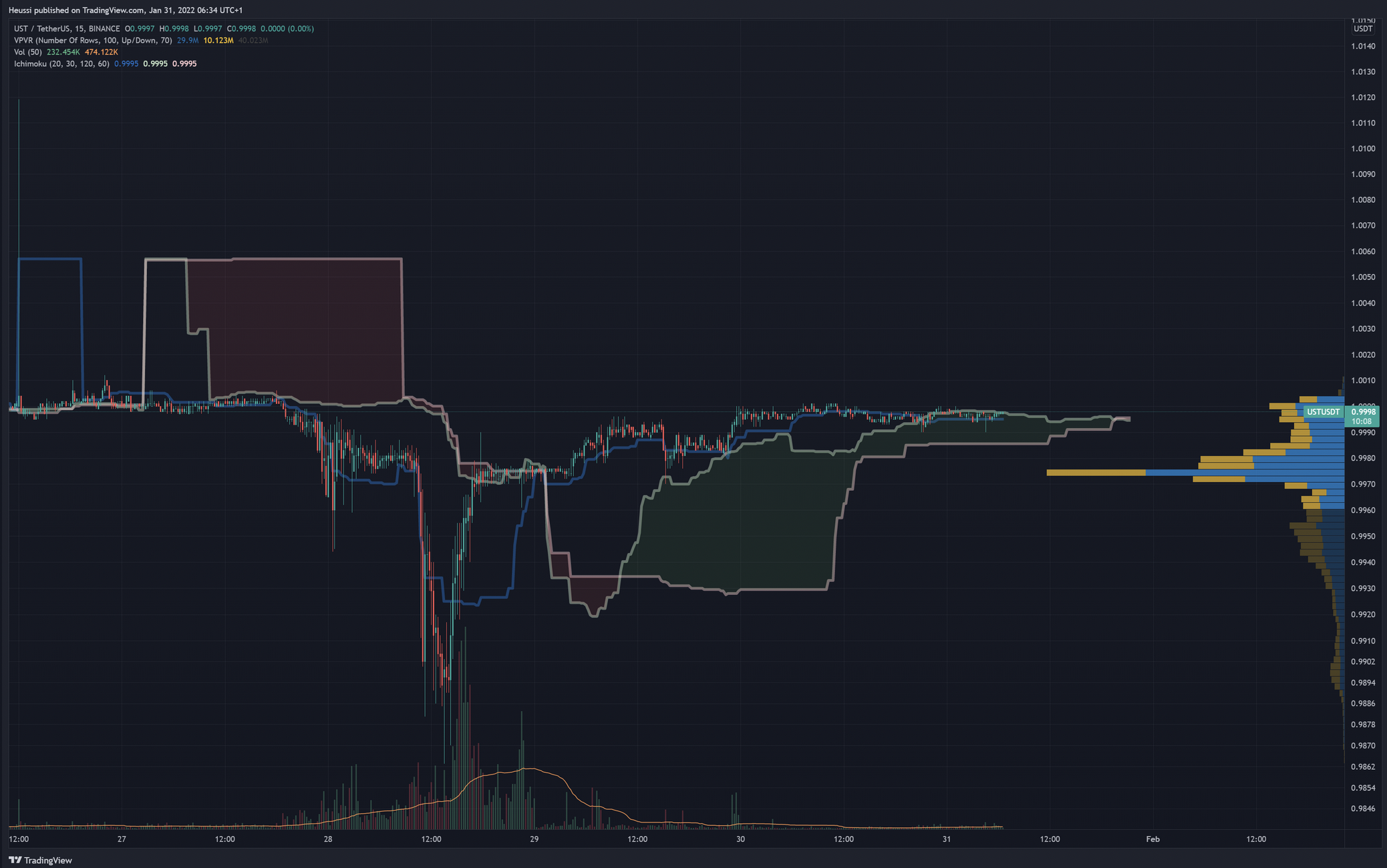 Dies löste eine regelrechte Panik aus, da die Händler nicht nur ihre geliehenen Positionen im Anchor Protokoll verloren (oder kurz davor standen, liquidiert zu werden), sondern nun auch mit einem Verlust von 1.5% ihres gesamten UST-Kapitals rechnen mussten, wenn sie ihr Terra-Exposure vollständig auflösen wollten. Die Panik war nur von kurzer Dauer, und der Wechselkurs wurde wieder auf fast 1:1 angehoben.
