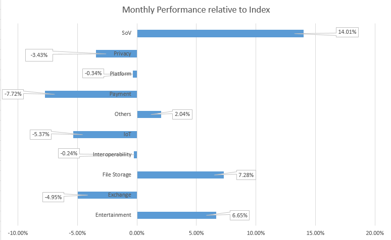 Der Index erzielte eine Performance von rund 36%, mit einigen Gewinner- und einigen Verlierersektoren (siehe monatliche Performance im Vergleich zum Index). Einer der Gewinnersektoren war SoV mit einer Outperformance von 14%; der Paymentsektor schnitt um 7,75% schlechter ab.