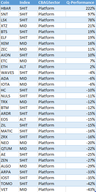 Dieser Sektor listet die meisten Coins. Einige von ihnen erscheinen in der Top-10-Liste, andere sind auch Teil der Liste der verlorenen Coins. Wenn man sich die vierteljährlichen Leistungszahlen ansieht, sieht man, dass sich mehr Coins im negativen Bereich befinden, aber einige von ihnen sehr gut abschneiden und dafür sorgen, dass der Sektor gegenüber dem Index nur 1,43% verloren hat. Insgesamt hat sich der Plattformsektor gegenüber den übrigen Sektoren ziemlich neutral entwickelt.