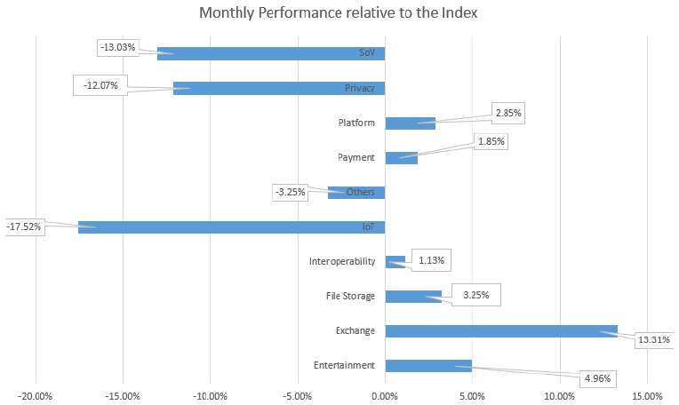 Während der letzten 30 Tage gab es eine ziemliche Verschiebung der Sektorperformances. Platform und Interoperability gehören nach wie vor zu den Gewinnern, aber Exchange, Entertainment und File Storage haben alle Sektoren übertroffen. Der anhaltende DeFi-Hype sorgt für viele neue interessante Projekte. Dies hat dazu geführt, dass die entsprechenden Coins auf dezentralen Plattformen gehandelt werden und schließlich an zentralen Börsen notiert werden.