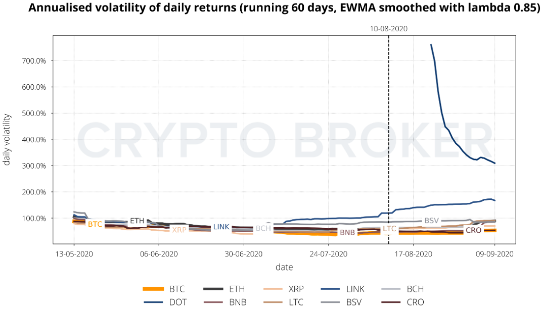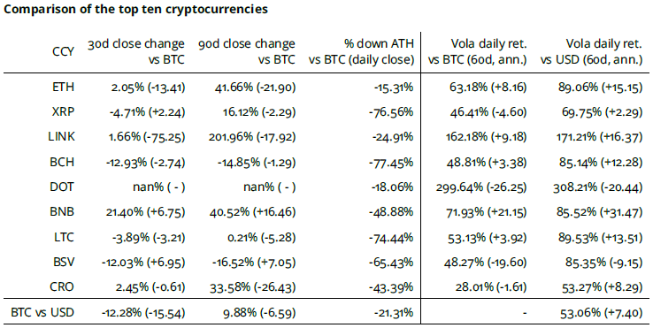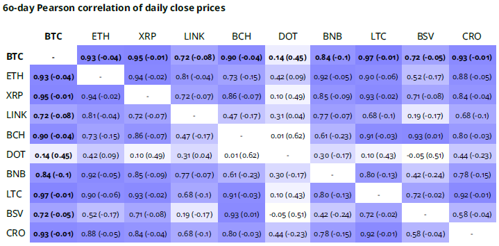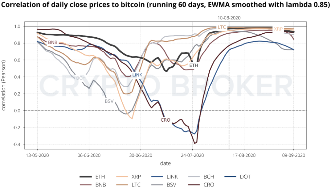 Im Allgemeinen war das Handelsvolumen hoch, aber aufgrund der aktuellen Marktsituation auch sehr volatil. Das Volumen erreichte seinen Höhepunkt während der Marktkorrektur Anfang September. Der Bitcoin (BTC) MACD hat sich nicht gross verändert und bleibt im überverkauften Bereich. Es war ein weiterer Monat, in dem die Altcoins outperformten, doch aufgrund der Marktkorrekturen haben sie sich vom überkauften in den neutralen Bereich verschoben. Die Coins auf den Rängen 2 bis 50 blieben überkauft. Die Korrelation hat sich etwas geglättet, aber das hängt sehr stark vom jeweiligen Sektor ab und davon, welche Coins konkret miteinander verglichen werden.