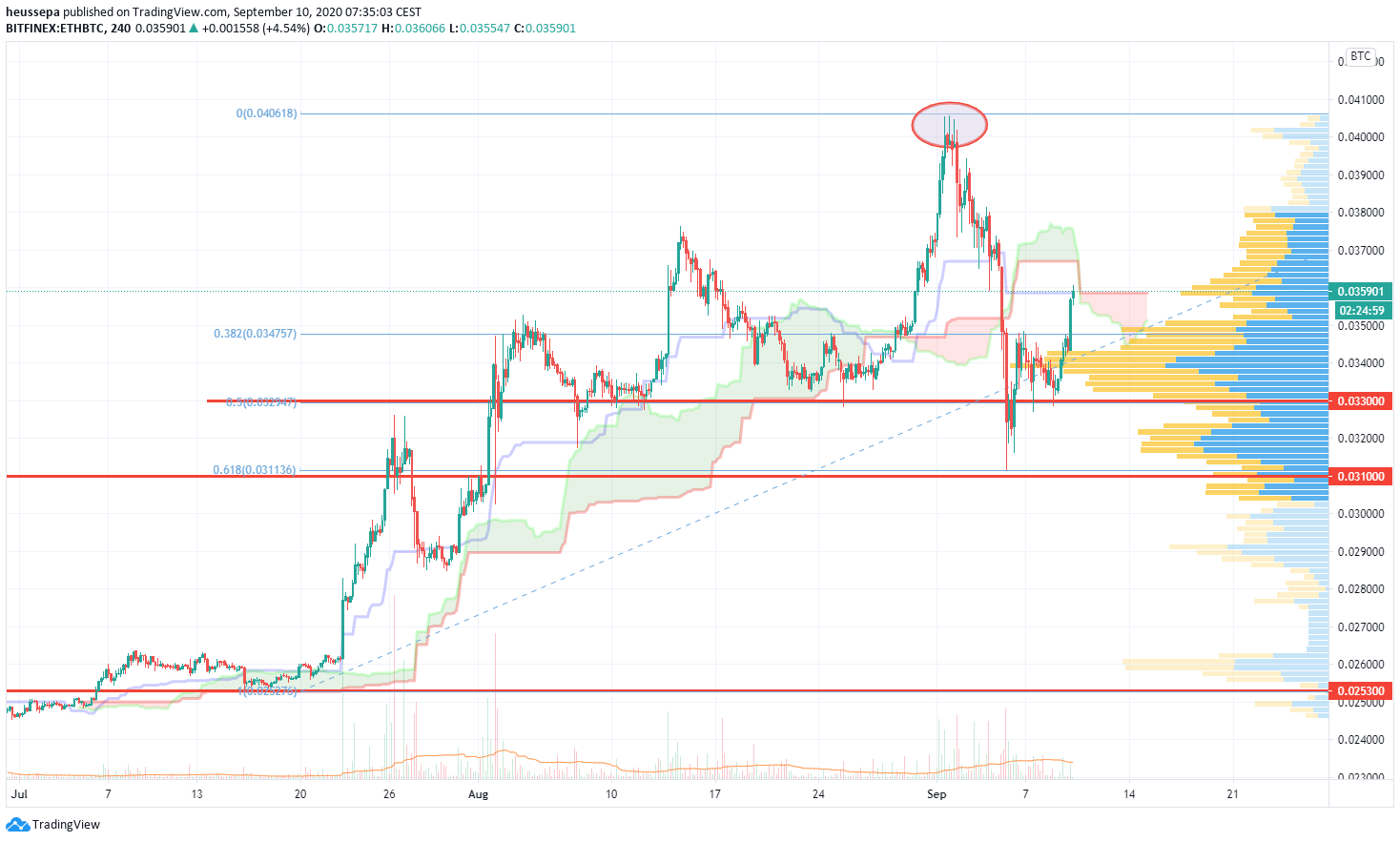 Wir hatten also unseren ersten Parabelbruch im DeFi-Sektor. Die Grafik des ETHBTC zeigt dies sehr schön (roter Kreis). Der Markt brach so schnell ein, wie er nur wenige Tage zuvor nach oben gegangen war. Die Niveaus 0,031 und 0,033 funktionierten gut als Unterstützung während des Ausverkaufs.