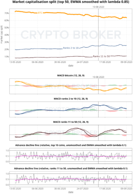 Advance Decline Line – Die Advance Decline Linie zeigt das Verhältnis der Coins, bei denen die Marktkapitalisierung im Vergleich zur Marktkapitalisierung von BTC für jeden Tag gestiegen ist.