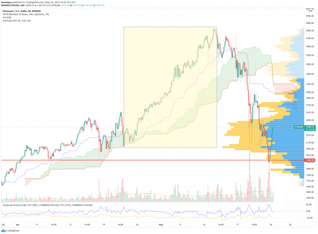 Und nun der Teil, der meine Sicht verschwommen hat. Als BTC in meinen alten Konsolidierungsbereich von $44-50k einbrach, verwandelte sich ETH in eine Rakete und stieg zwischen dem 23. April und dem 12. Mai um über 108% an (siehe Chart unten).