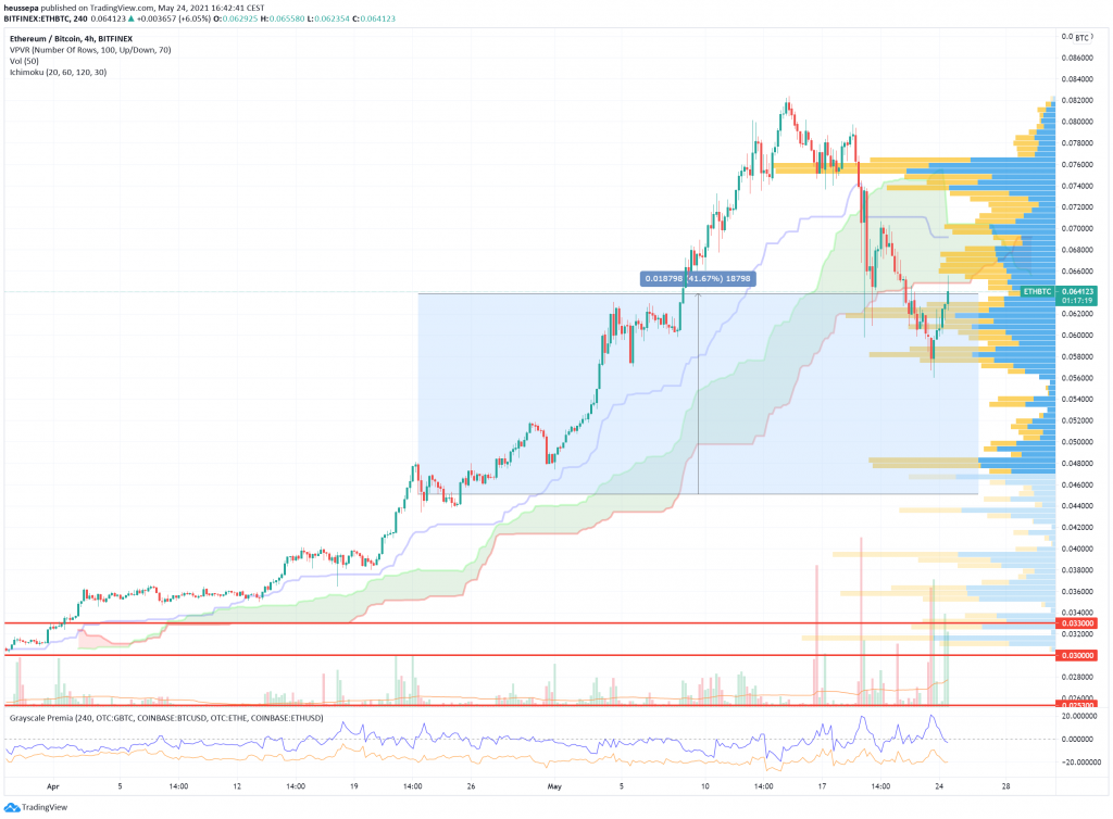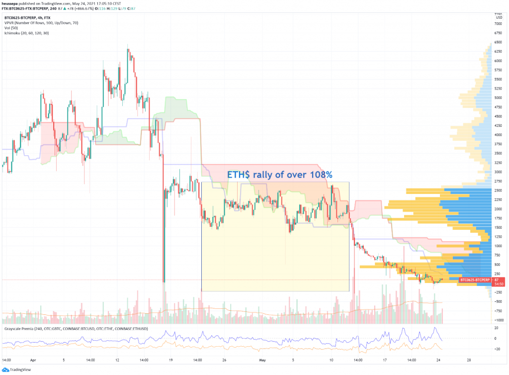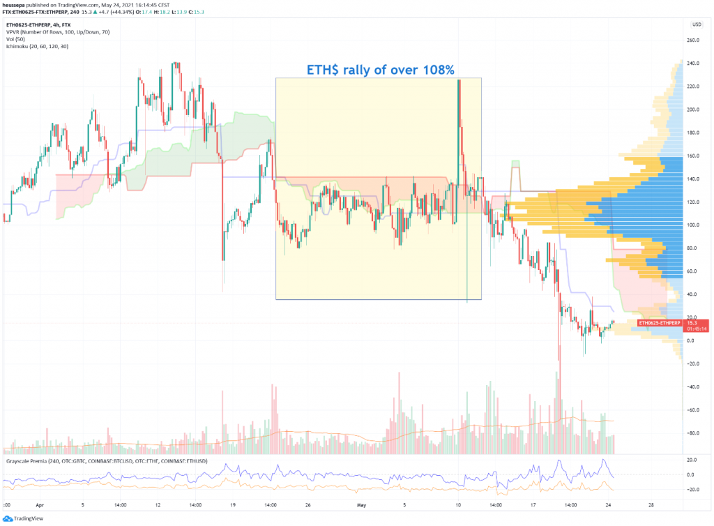 Dann trafen uns Makro-Ereignisse hart. Elon Musk (12. Mai) und später Hongkong und China (21. Mai). Vor allem die Nachrichten aus China lösten ein massives Spot-Verkaufsvolumen von chinesischen Investoren aus. Nichtsdestotrotz hat sich ETH über diese verrückte Zeitspanne vom 23. April bis jetzt viel besser geschlagen. ETHBTC ist zum Zeitpunkt der Erstellung dieses Artikels immer noch um etwa 40% gestiegen (siehe Grafik unten).
