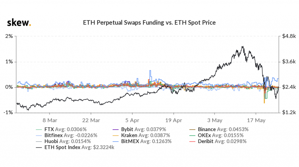 Die ETH-Rallye wurde nicht nur von Derivaten angetrieben. Die Finanzierungsraten in Perpetuals und die Laufzeitbasis sowohl von ETH als auch von BTC waren immer noch auf hohen Levels, aber nicht annähernd auf dem Niveau vom 19. April (siehe Bilder unten). Es musste auch eine Menge an Spot-Käufen geben.