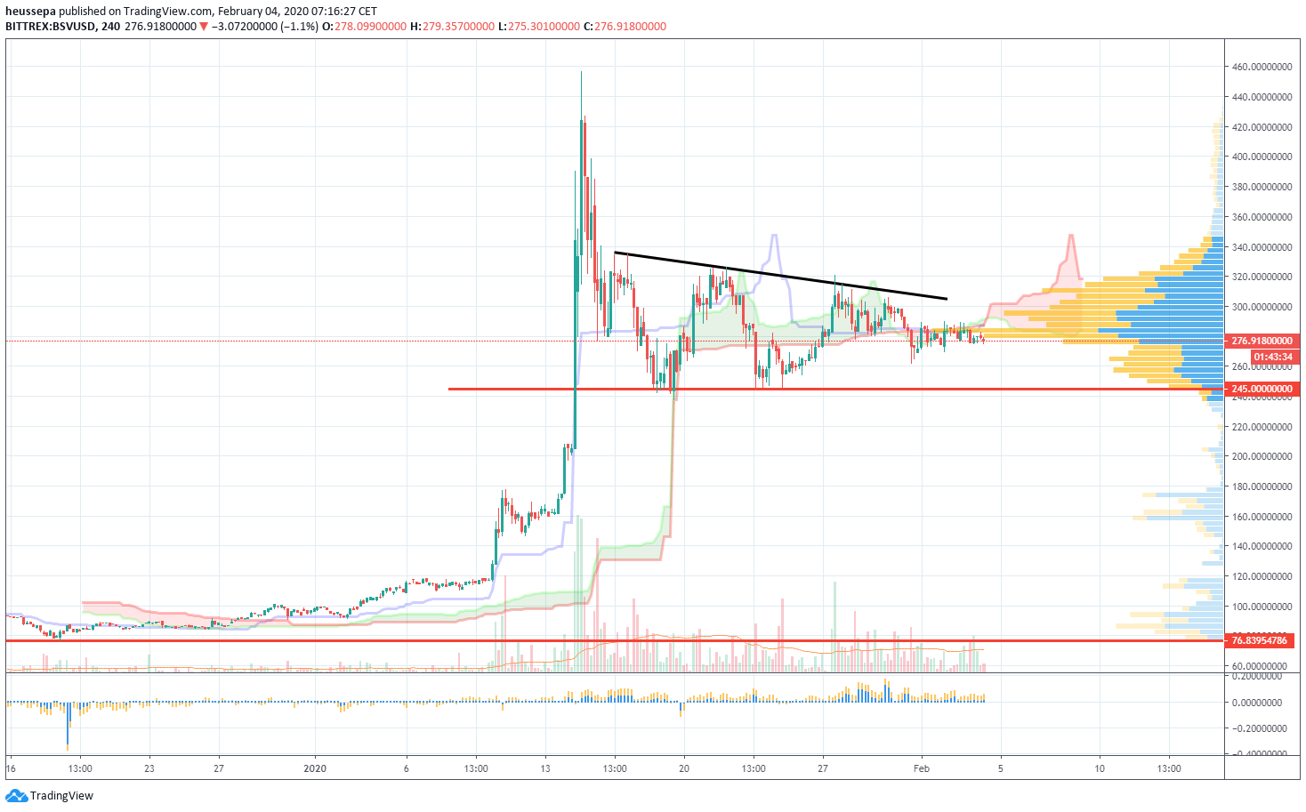 Wir sehen eine Konsolidierung wie aus dem Lehrbuch, jedoch ist noch nicht klar, in welche Richtung dieser Coin gehen wird. Beobachten Sie die obere Trendlinie (schwarz) und die Unterstützungslinie bei 245 Dollar (rot).