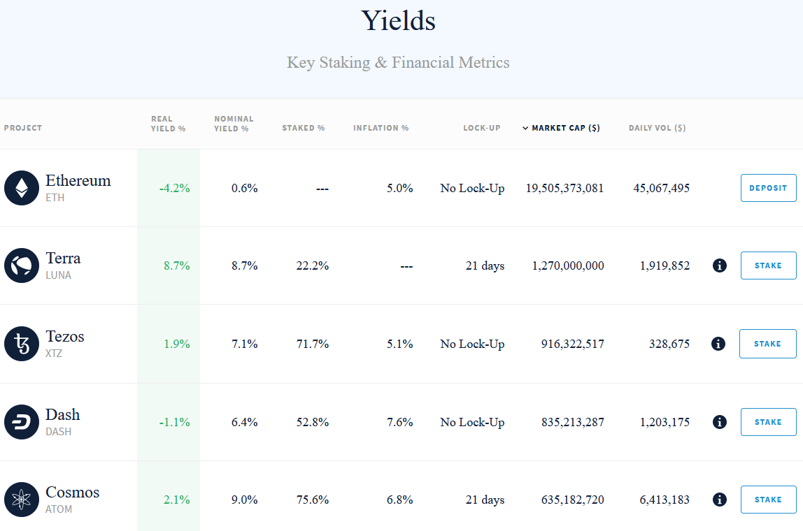 Allerdings gibt es wirtschaftliche Variablen zu berücksichtigen, bevor man mit dem Staken beginnt. Die Leute vergessen, dass die Stakingerträge nicht der einzige Faktor ist, der für Ihre Investition zählt. Die meisten dieser Token haben eine ziemlich hohe Inflation (durch den zukünftige Versorgungsplan der Token). Darüber hinaus haben einige von ihnen sogar eine Sperrfrist. Daher sollten Sie sich auf die "Realrendite" sowie auf die Liquiditätsaufschläge konzentrieren, die Sie beim Staken eines Tokens erhalten sollten.