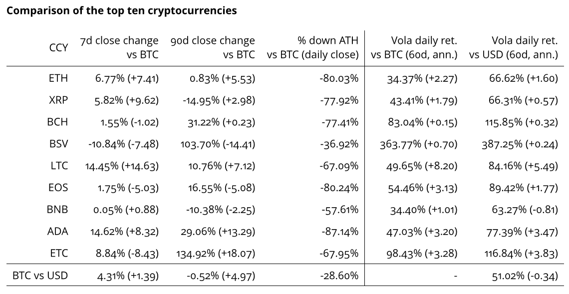 Vergleicht man die USD-Performance der Bestandteile der drei Indizes, so gab es nur drei Coins, die sich negativ entwickelten. ZEN verlor 6,8%, DASH 1% und LEO 0,2%. Alle anderen Coins schlossen positiv.
