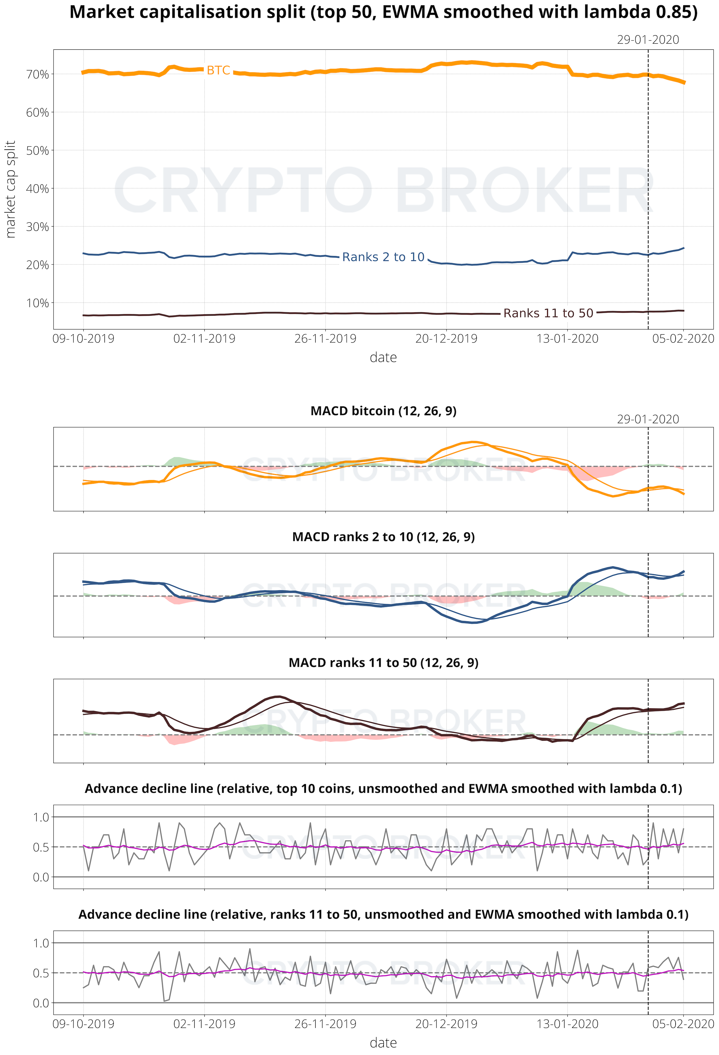 Advance Decline – Die Advance Decline Linie zeigt das Verhältnis der Coins, bei denen die Marktkapitalisierung im Vergleich zur Marktkapitalisierung von BTC für jeden Tag gestiegen ist.