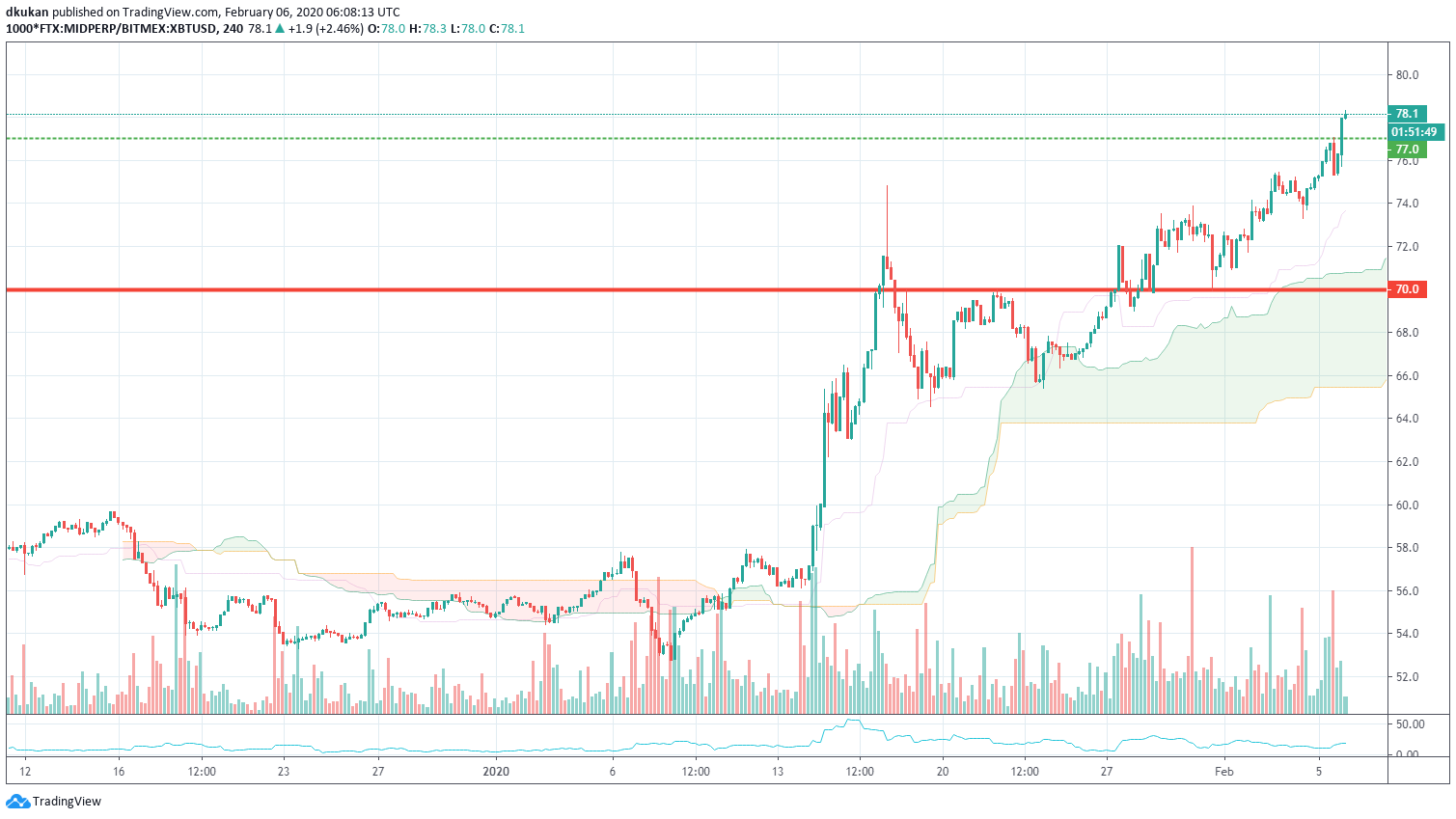 MID: Unterstützung 70 / Widerstand 77 / MID 4h Chart