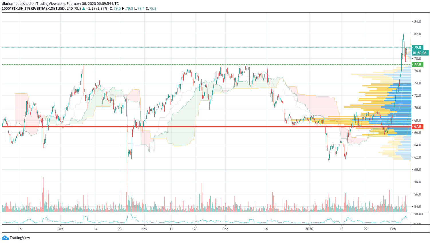 SHIT: Diagramm Unterstützung 67 / Widerstand 77 / SHIT 4h