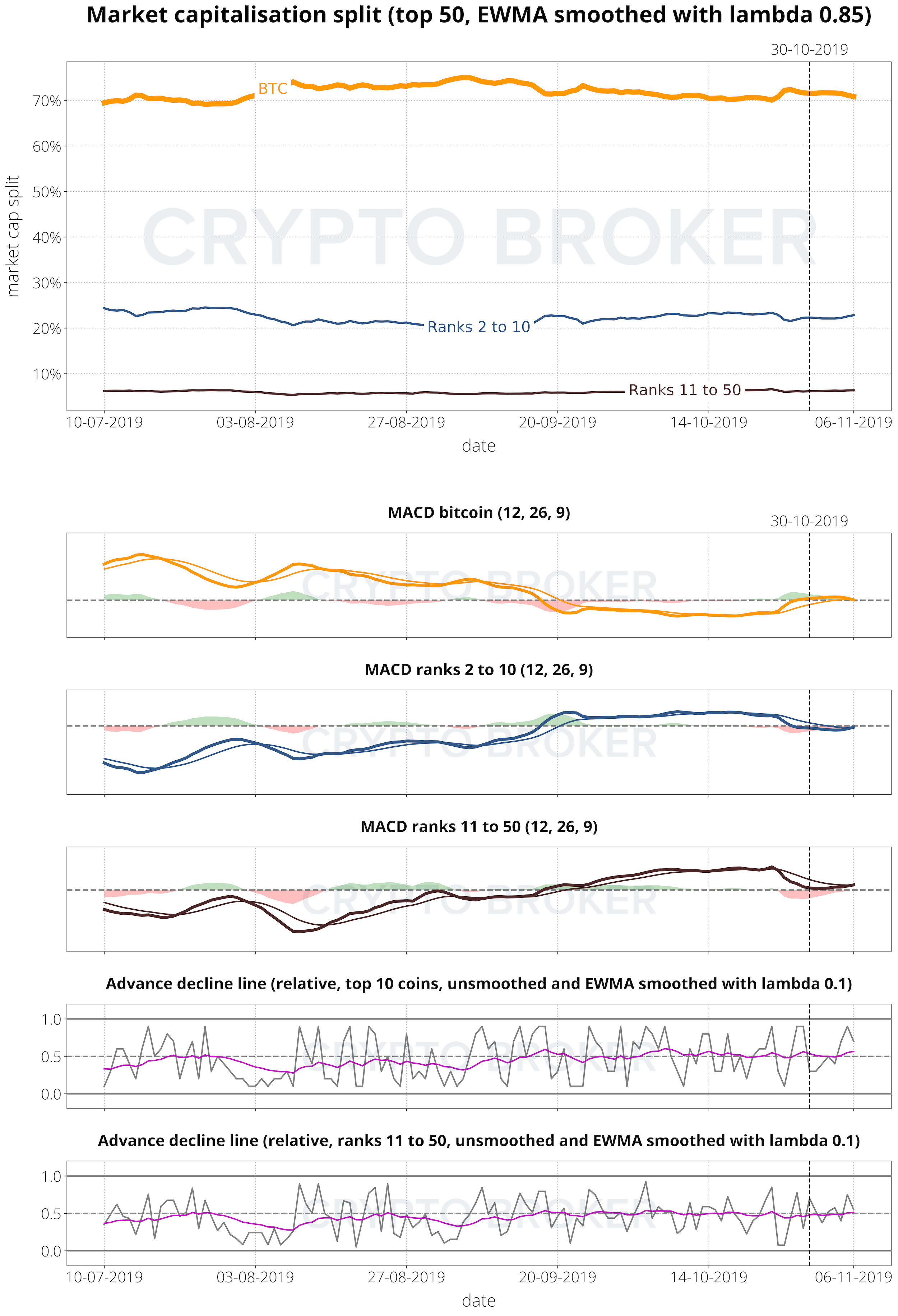 Verstehen Sie mich nicht falsch, nicht alle Altcoins bewegen sich wieder nach oben. Es ist sehr selektiv und im Top-100-Coinuniversum haben wir etwa 15 Coins mit einer starken Outperformance gesehen, was diese drei Indizes in die Höhe getrieben hat. Es bleibt noch abzuwarten, ob sich dieses Muster wiederholt, falls wir einen weiteren Push in BTC$ sehen.