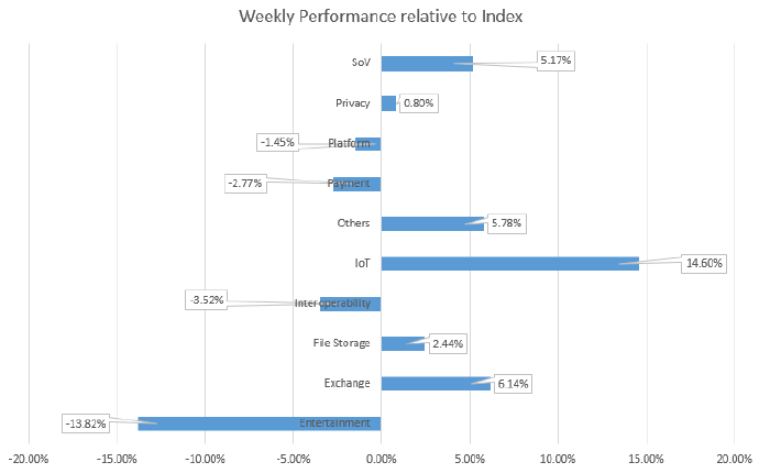 Die Gewinner des Sektors sind Internet of Things, Store of Value und Exchange. Zu den Sektorverlierern gehören Entertainment, Interoperability, Payment und Plattform.