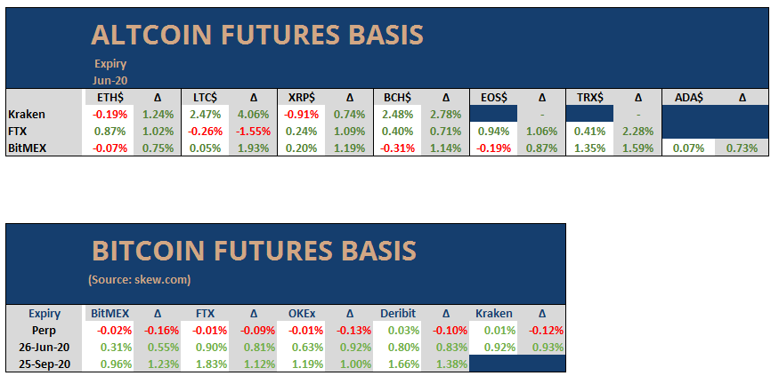 Die Situation für BTC- und ETH-Zukünfte verändert sich langsam wieder in Richtung Contango. Die Juni 2020-Futures von BTC und ETH bewegen sich um 0,5%. Andere Altcoins befinden sich ebenfalls in leichtem Contango. Was den längerfristigen Kontrakt betrifft, so handelt der September 2020-Kontrakt zwischen 1% und 1,5%. Daraus ergibt sich eine ziemlich lineare (oder flache) Kurve vom Spot bis September 2020. Es gibt im Moment nicht viel Positionierung, die man von der zukünftigen Basis ablesen oder vorhersagen kann, und ich glaube, dass sie die aktuelle Marktlage sehr genau widerspiegelt, d.h. "keine starke Meinung".