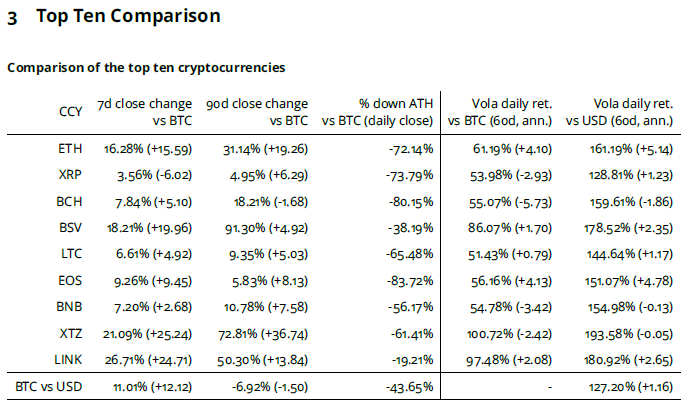 Link (im Sektor Internet der Dinge) erzielte +40%. Die neuen Coins OKB +49% und BTG +33% gehörten zu den Coins mit der besten Performance seit der letzten Index-Neugewichtung.