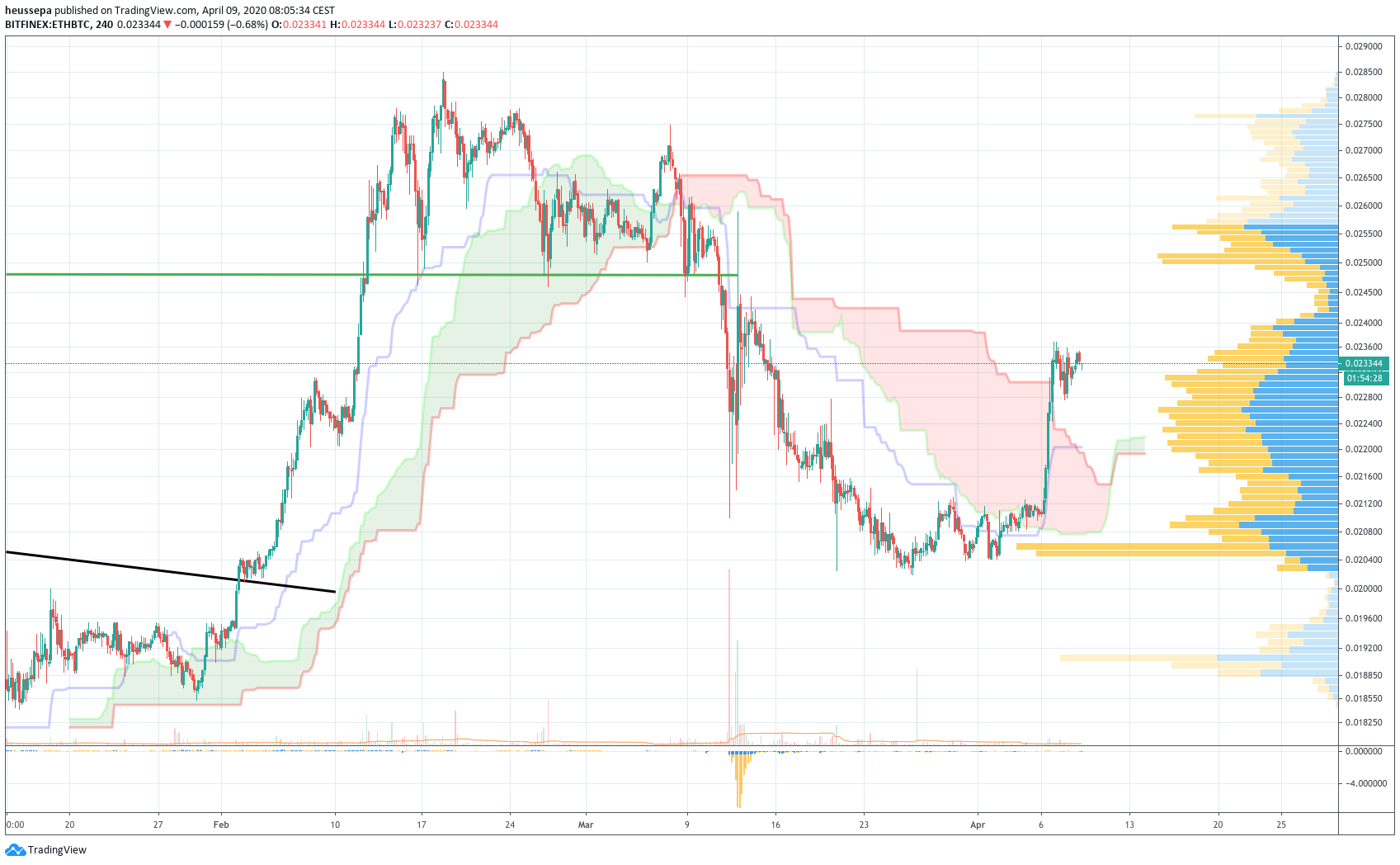 Um 0,02360 stießen wir auf einigen Widerstand und in den letzten Tagen haben wir uns um den Wert von 0,0230 konsolidiert. Auf der Tages-Chart hat sich das Blatt sogar gewendet: Es gelang uns, in die Ichimoku-Wolke einzudringen.