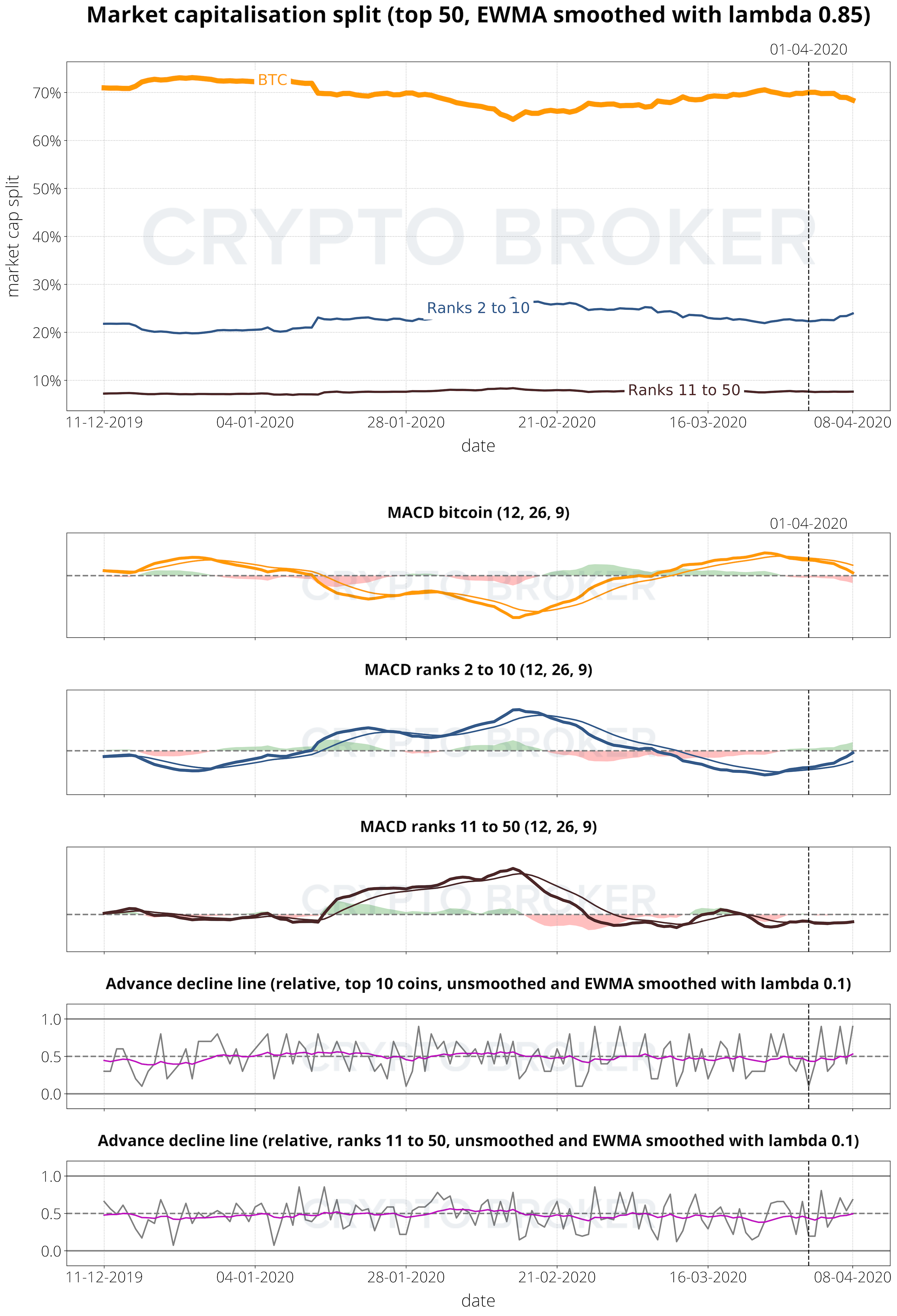 Die MACDs haben sich für alle Coins geändert. BTC bewegte sich von überkauften Coins in die neutrale Zone. Auch Coins mit einem Rang zwischen 2 und 10 bewegten sich von einer überkauften Situation in eine neutrale Zone. Alle anderen Coins bleiben neutral.