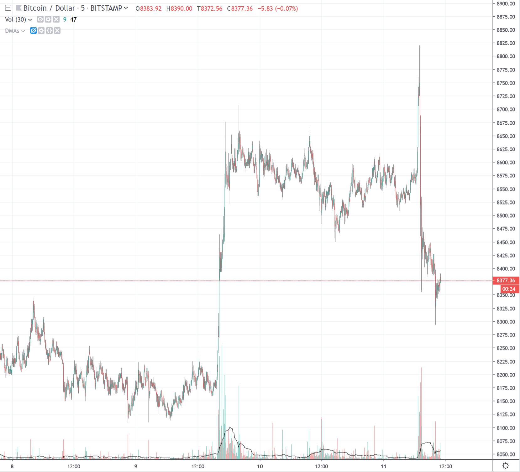 Die Märkte haben diesen Freitagmorgen einen steinigen Start hingelegt. Zuerst sahen wir am frühen Morgen des europäischen Handelstages einen schönen Schub nach oben, wobei BTC$ knapp über 8.800 $ lag. Es folgte ein starker Ausverkauf, der die Preise noch tiefer als im Nachtdurchschnitt trieb: auf ein Tief von rund 8.370 US-Dollar.