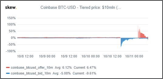 Es sieht so aus als hätte es gestern am späten Nachmittag begonnen, dass die Angebotsseite anfing, sehr dünn auf dem Auftragsbuch zu werden. Es hätte mehr als 50% an Spread Crossing gekostet, um eine Order im Wert von $10 Mio. Bitcoins zum Verkauf auszuführen. Die Dinge begannen sich zu normalisieren, gingen dann aber ins andere Extrem, wobei die Angebotsseite verschwand. Und irgendwann lagen Ihre Kosten für die Spread-Überquerung zur Ausführung einer 10 Mio. $ Bitcoin-Kauforder bei fast 100% (in USD ausgedrückt wären das über 8.000 $ an Geld- und Briefspannen). Somit war praktisch keine Liquidität mehr in diesem Auftragsbuch vorhanden.