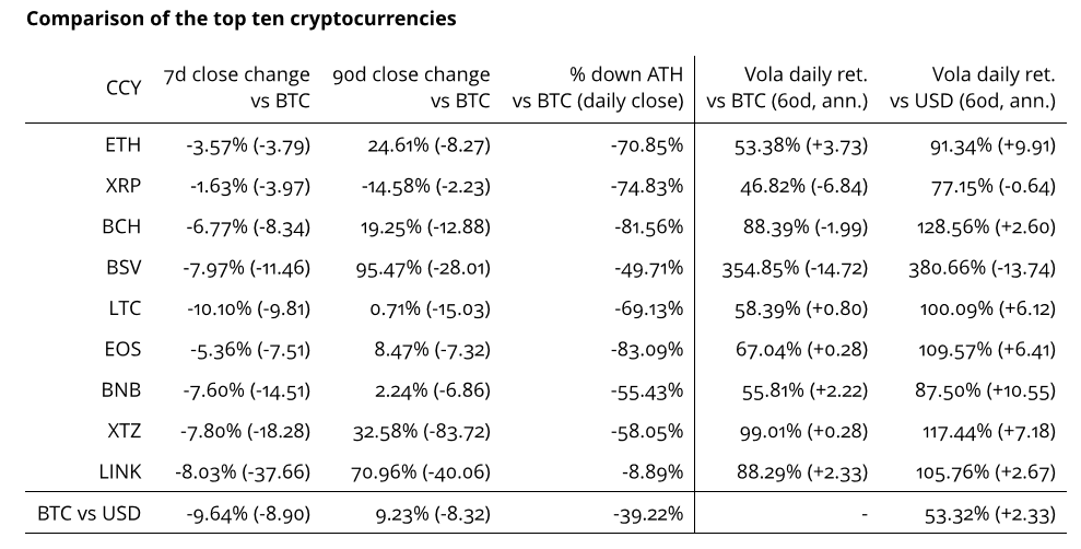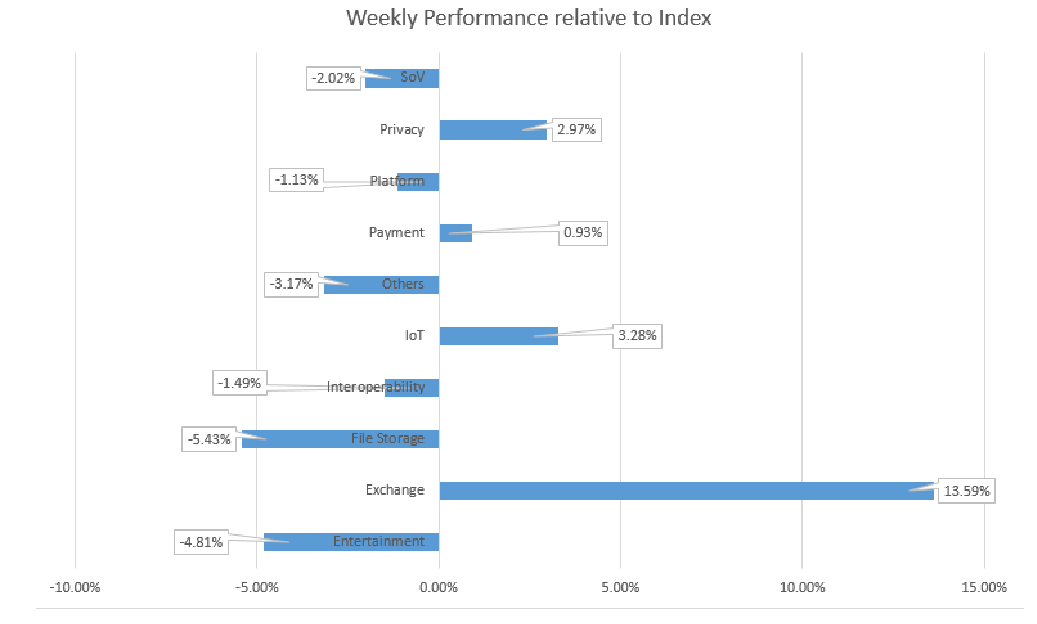 Der Alt- und der Mid-Index haben innerhalb der Korrektur Unterstützungslinien durchbrochen, während der Shit-Index immer noch über der Unterstützung gehandelt wird. Der Exchangesektor ist tatsächlich der einzige Gewinnersektor in dieser Woche. Die Coins KNC und LEO haben den Index um fast 4% übertroffen. Etwas besser entwickelte sich der Sektor Privacy and IoT, in dem der Coin GXC zu den Gewinnern gehörte. Alle anderen Sektoren: Entertainment, Interoperabilität, Plattform und SoV gehörten zu den unterlegenen Sektoren. Die meisten Coins verloren zwischen 20% und 30%, wobei für WAVES eine positive Entwicklung im Plattformsektor erwartet wird. Die Gewinncoins im Vergleich zur US$-Leistung waren LEO, KNC und STEEM mit einem Durchschnitt von + 3%. Die Verlustcoins waren THETA, POWR, MANA, LOOM, ELF, ENG, BTS, AION, XTZ und VET, mit einem Durchschnitt von 30%.
