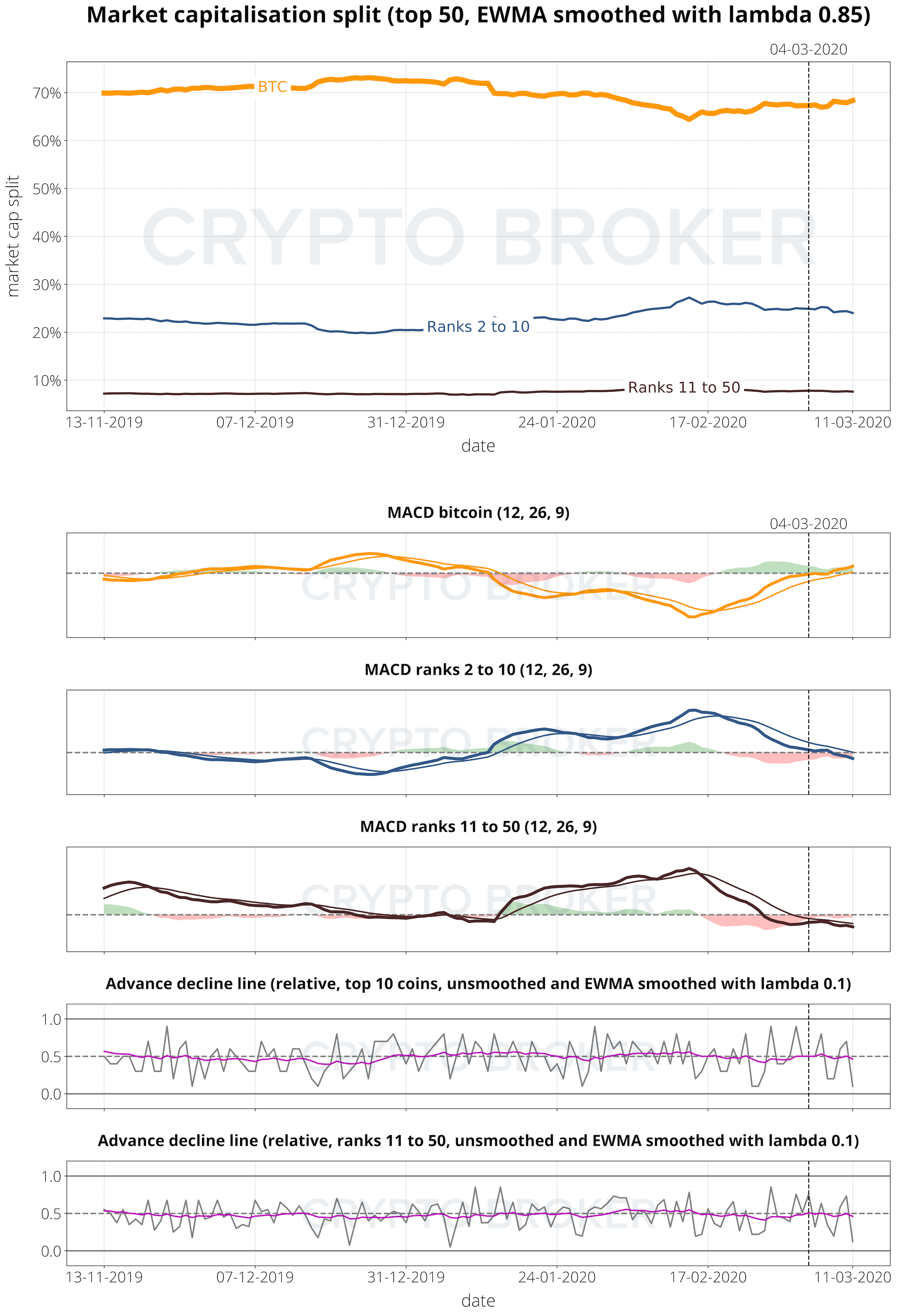 Das MACD-Bild hat sich nicht dramatisch verändert. BTC befindet sich nach wie vor in einer neutralen Zone mit dem Potential, weiter aufzusteigen. Coins mit einem Rang zwischen 2 und 50 sind leicht überverkauft und haben auch das Potential, nach oben zu korrigieren.