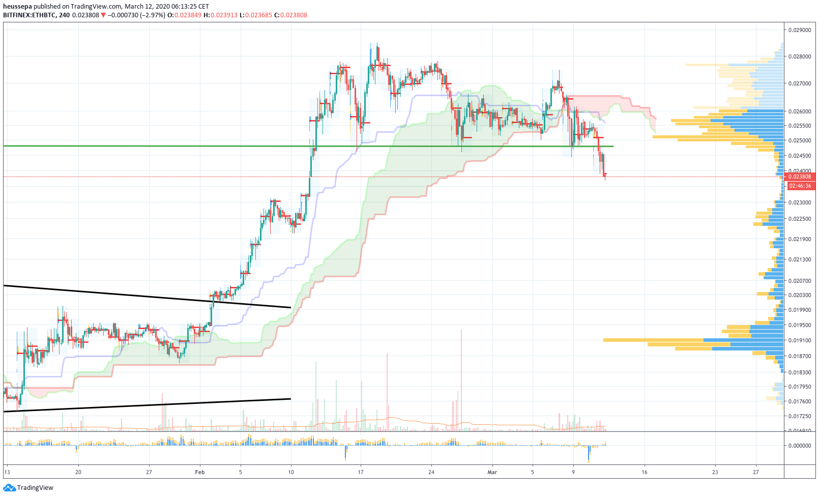 Bei den gegenwärtigen Marktbedingungen, die sich meiner Meinung nach in nächster Zeit nicht ändern werden, suche ich nach niedrigeren Niveaus bei ETH/BTC: mehr in Richtung 0,0190.