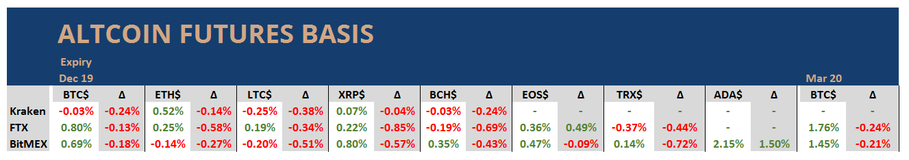 Abgesehen von Cardano (ADA) liegt die Altcoin-Basis bei null gegenüber dem Dollar. Dies ist auf die positive Bitcoin-Basis zurückzuführen und impliziert daher eine negative Basis gegenüber Bitcoin.