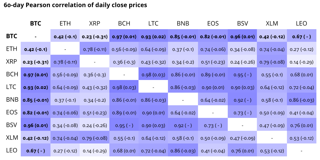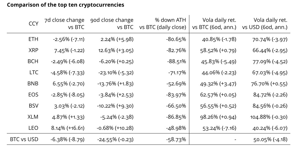 Die Situation für die grössten Altcoins ist jedoch eine eher gemischte Angelegenheit. ETH, BCH, LTC und EOS entwickelten sich sogar schlechter als Bitcoin, während XRP, BNB und LEO nicht nur Bitcoin outperformen konnten, sondern auch positiv waren (sogar in USD).