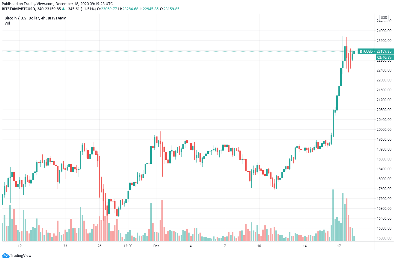 Es gab aber nicht nur sehr positive Nachrichten über Bitcoin in letzter Zeit, auch Ethereum (ETH) wird an massenhafter Adoption gewinnen, wenn die CME-Börse im Februar 2021 ETH-Futures einführt. Der interessanteste Aspekt des gestrigen Tages war das Verhalten der Marktteilnehmer. Im Gegensatz zu anderen volumengetriebenen Tagen sahen wir einen massiven Flow in zwei Richtungen. Auf der einen Seite haben viele Marktteilnehmer Gewinne realisiert und ihre Positionen geschlossen; auf der anderen Seite haben viele auch neue eröffnet.