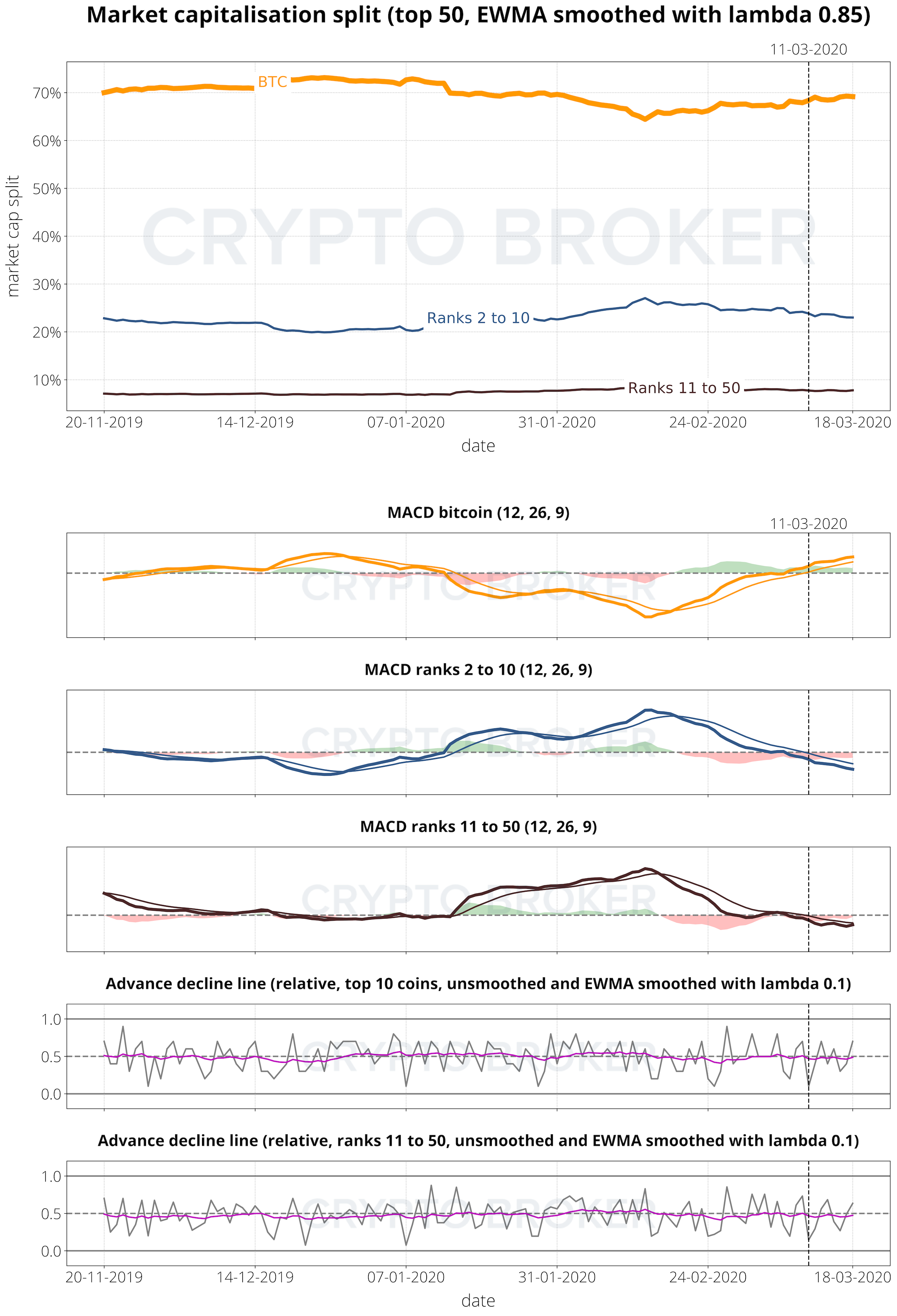 Die MACDs für BTC zeigen eine leicht überkaufte Situation, während die Coins auf den Rängen 2 bis 10 leicht überverkauft sind. Coins auf den Rängen 11 bis 50 weisen auf eine neutrale Zone hin.